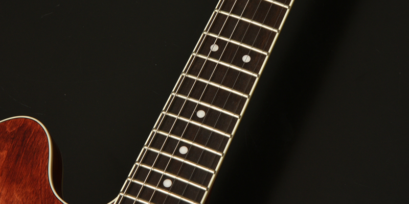 番手の違うサンドペーパーやスチールウールなどを使い分け、各フレットのエッジ部分に丁寧に丸みを付けることにより、左手の移動が滑らかになりました。ハイフレットまで滑るように移動が可能です。