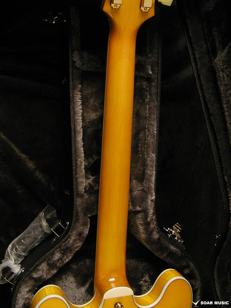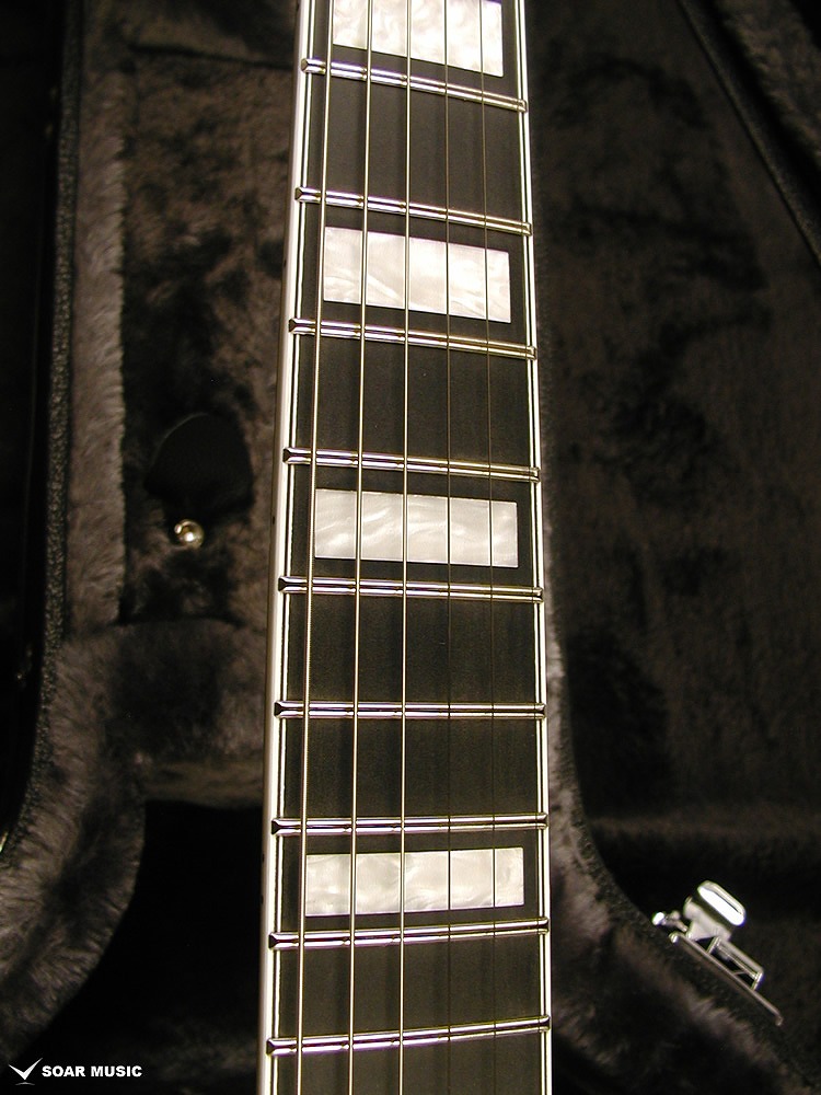 “77”を図案化したオリジナルのヘッドインレイが輝くヘッド。バインディングと組み合わせてスタンダードモデルには無い豪奢な雰囲気が漂います。