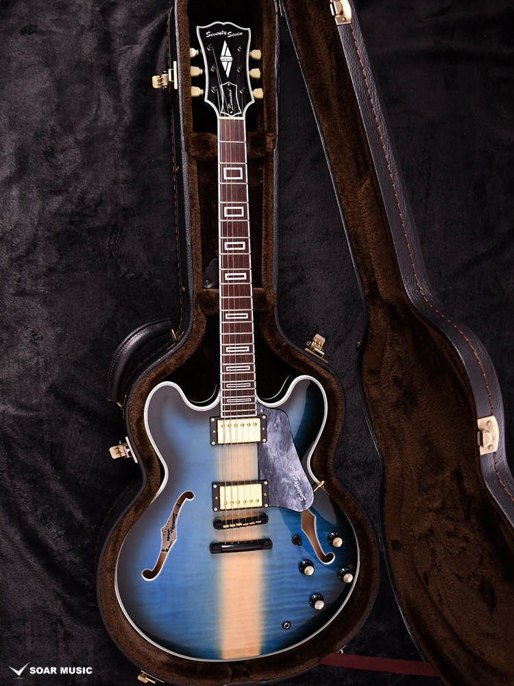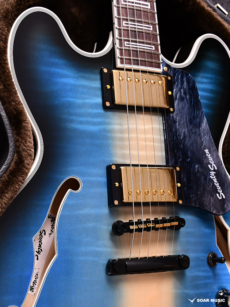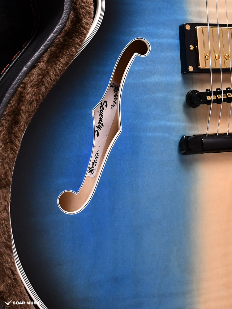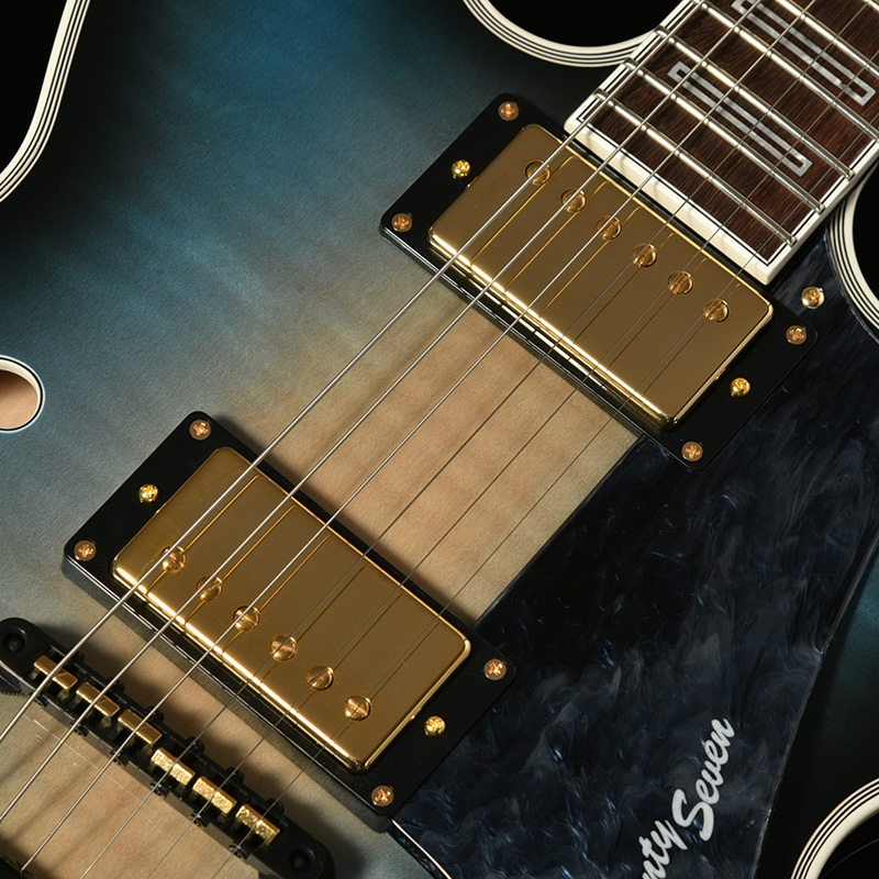 セミホロウ構造の特徴的なサウンドをナチュラルに出力するために、MojotoneとSeventySevenが共同開発したダブルネームピックアップを採用。アルニコ2マグネットにコイルのターン数を抑えた低出力のPUを搭載することで、歪ませてもクリアな音が保たれ、引き締まった低音と豊かなサスティーンを引き出します。