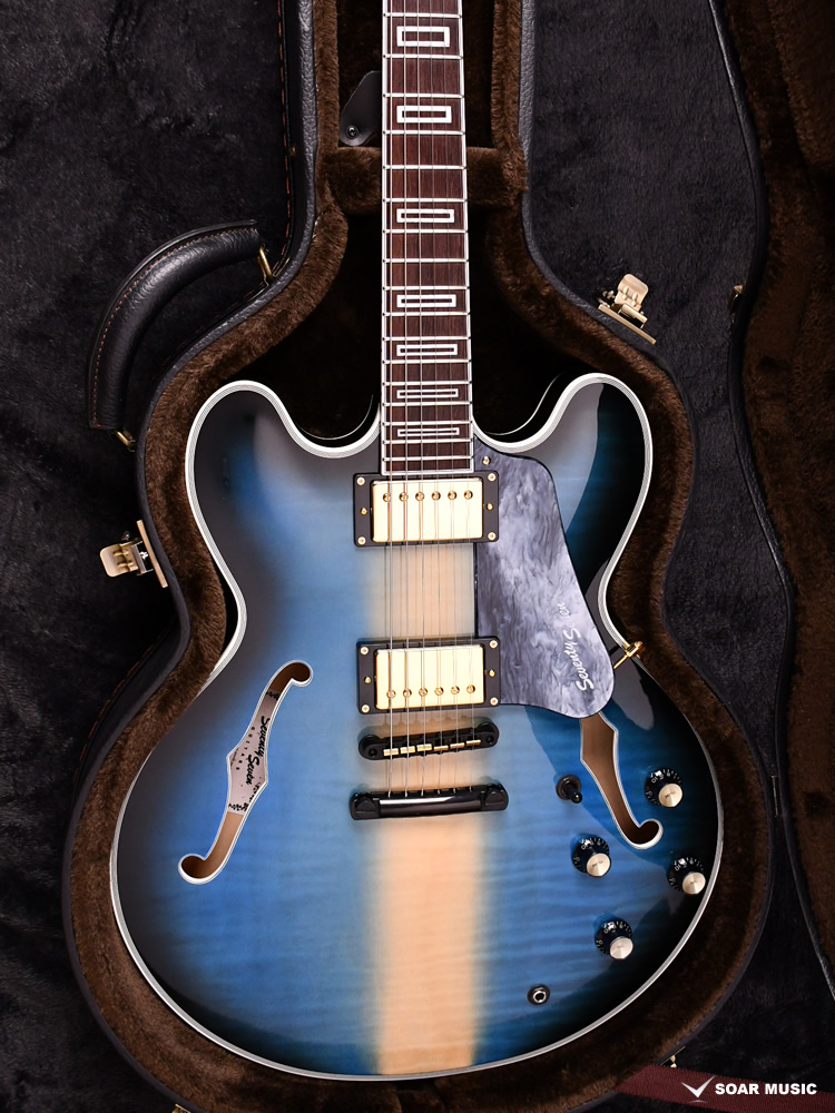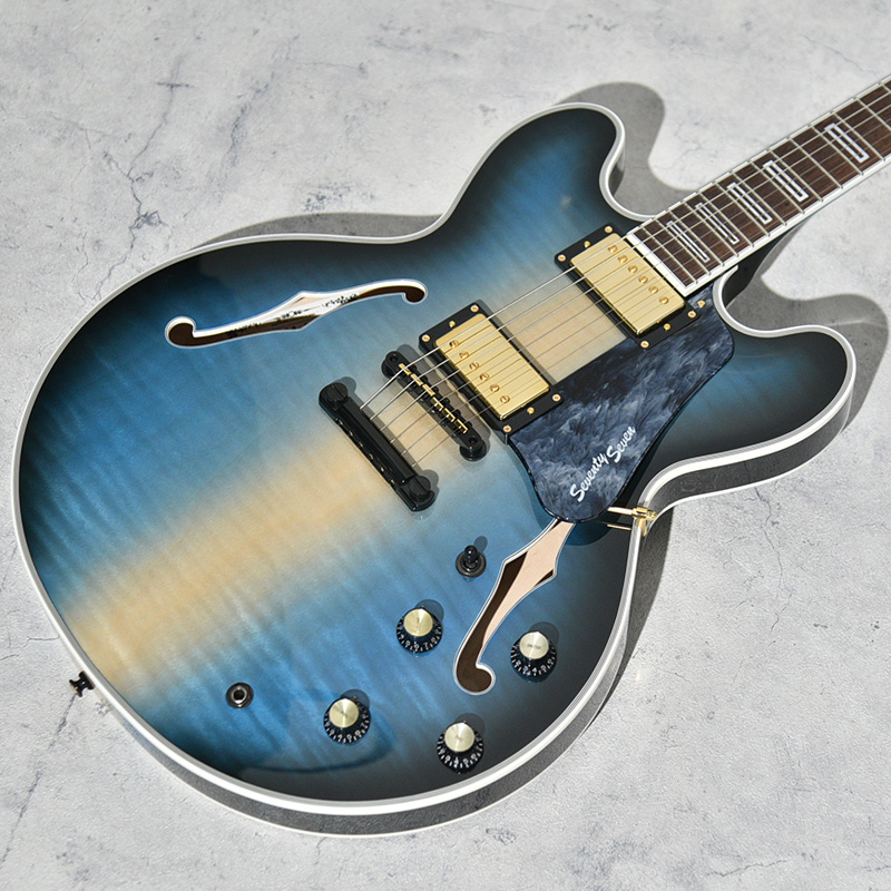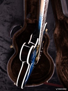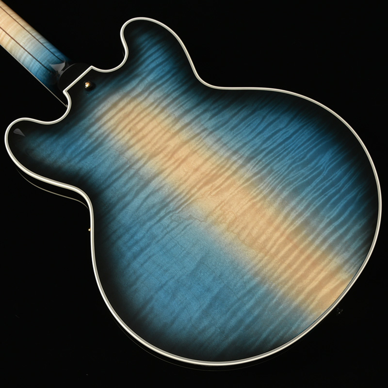 縦方向に広がる青のグラデーションにブラックのバーストカラーを掛け合わせた、塗装職人の繊細な技術が光る一本です。ボディ中央部をあえて着色せずメイプル本来の色味を残すことで、美しい色の対比が生み出されています。
