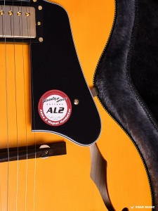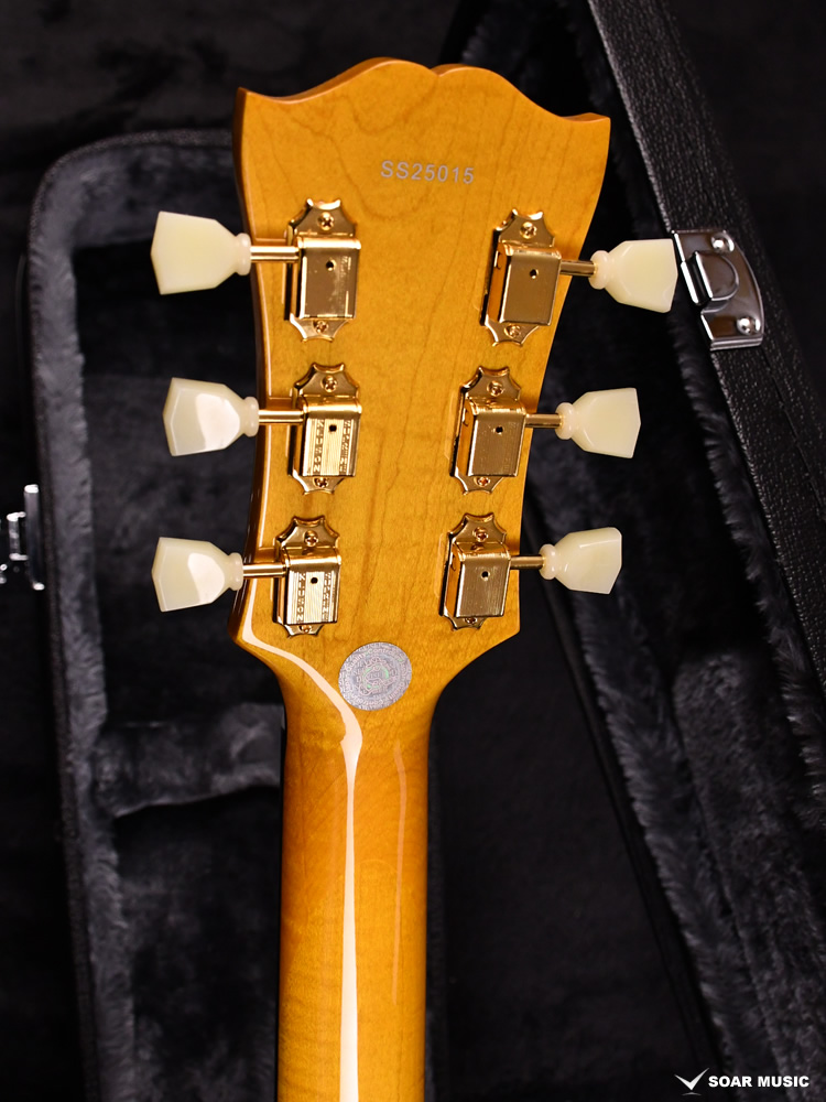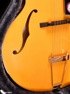 フルアコースティック仕様にともない、アーチトップに合わせて作られたオバンコール材のブリッジを装備。金属製のものに比べて、深みのある温かいサウンドが特徴です。