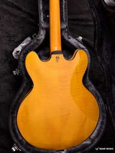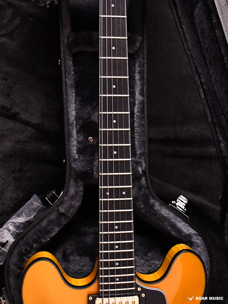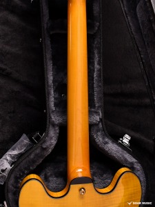 アコースティックギターの材料としてよく知られる、スプルースをボディトップに採用。フルホロウボディとの組み合わせで、薄同タイプでありながら豊かな生鳴りを実現しています。またセンターブロックを廃したことにより、本体重量も非常に軽量に。ボディのサイド&バックには杢目の鮮やかなフレイムメイプルを使用しており、ステージでも目を引く仕上がりです。