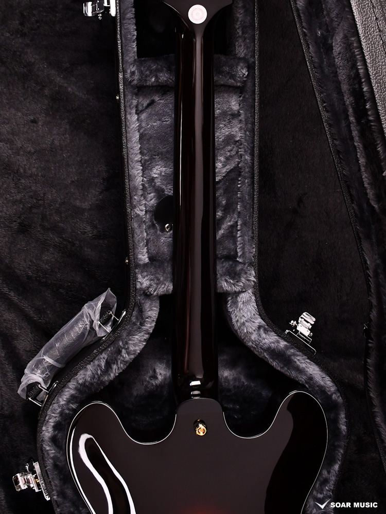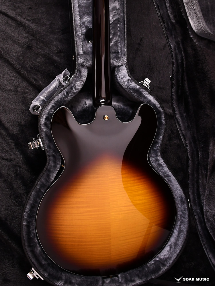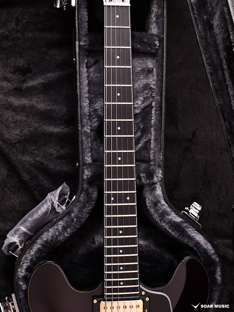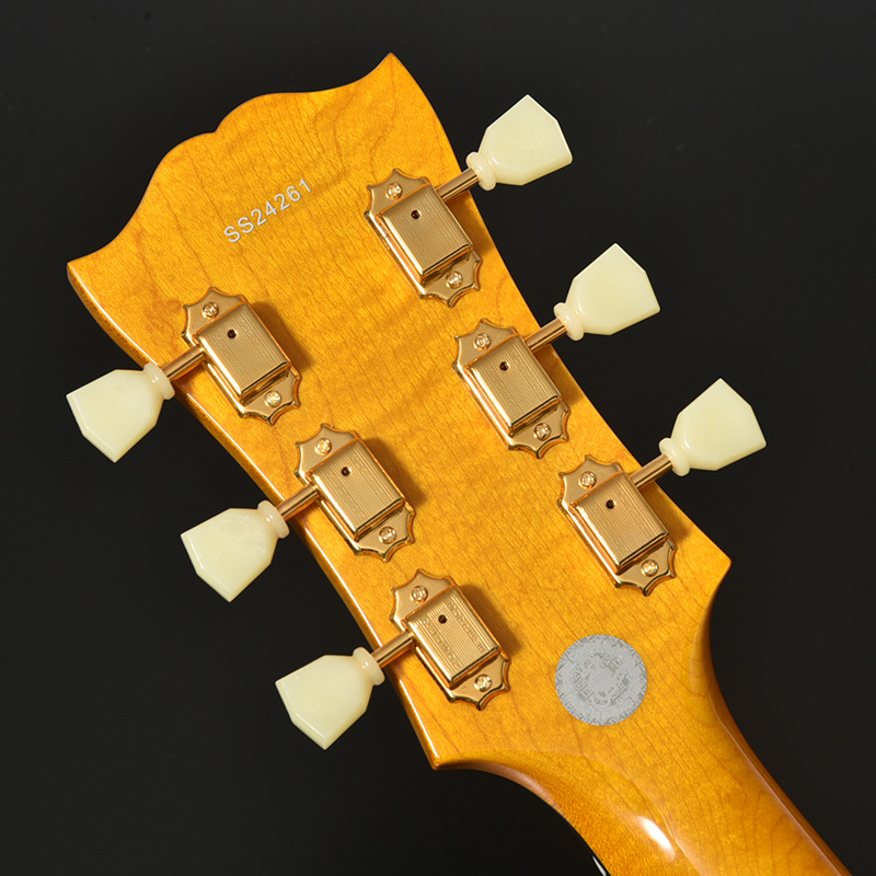 アコースティックギターの材料としてよく知られる、スプルースをボディトップに採用。フルホロウボディとの組み合わせで、薄同タイプでありながら豊かな生鳴りを実現しています。またセンターブロックを廃したことにより、本体重量も非常に軽量に。ボディのサイド&バックには杢目の鮮やかなフレイムメイプルを使用しており、ステージでも目を引く仕上がりです。
