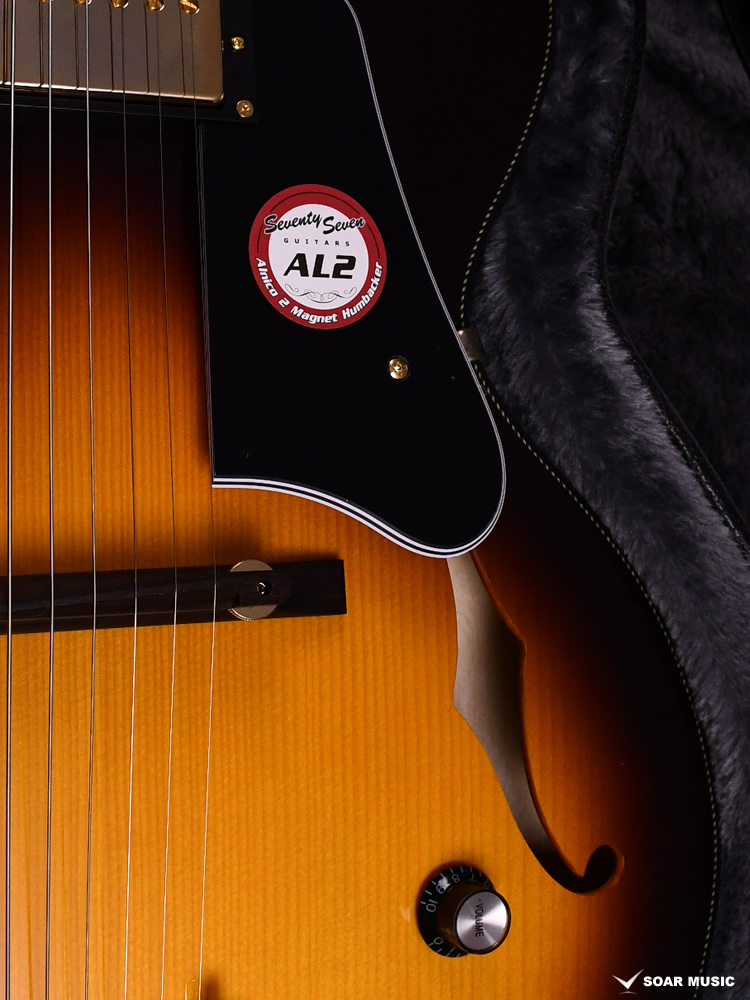 アルニコ2マグネットを採用したSeventySevenオリジナルピックアップ、 「SeventySeven AL2」を搭載。クリーントーンではきらびやかな鈴鳴り感を表現しつつも耳に痛くない暖かさを併せ持ち、ドライブをかけると歯切れの良いエッジの効いたクランチサウンドを出力します。プレイヤーの創造力を膨らませて豊かな演奏表現を生み出します。
