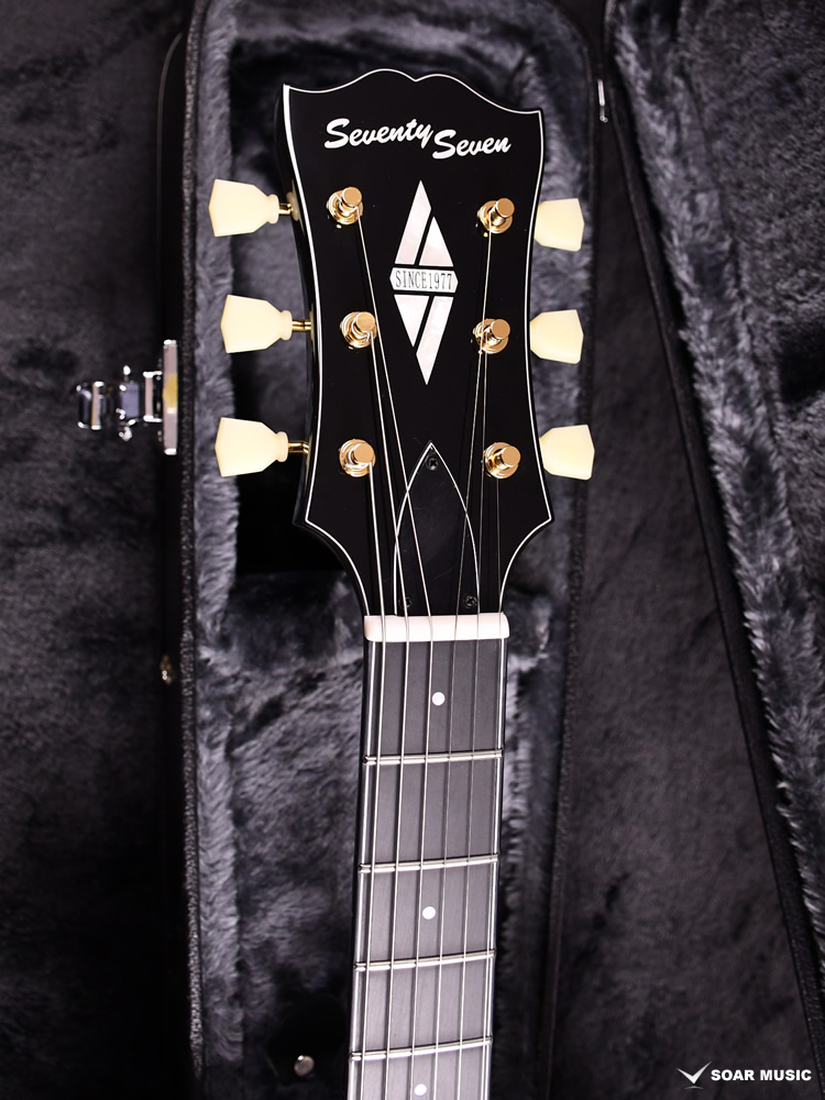 ボディにはアコースティックギターを思わせるヘリンボーンのパーフリングを装飾。ヘッドにはSeventy Sevenのトレードマークである”77″を模ったインレイが施されています。