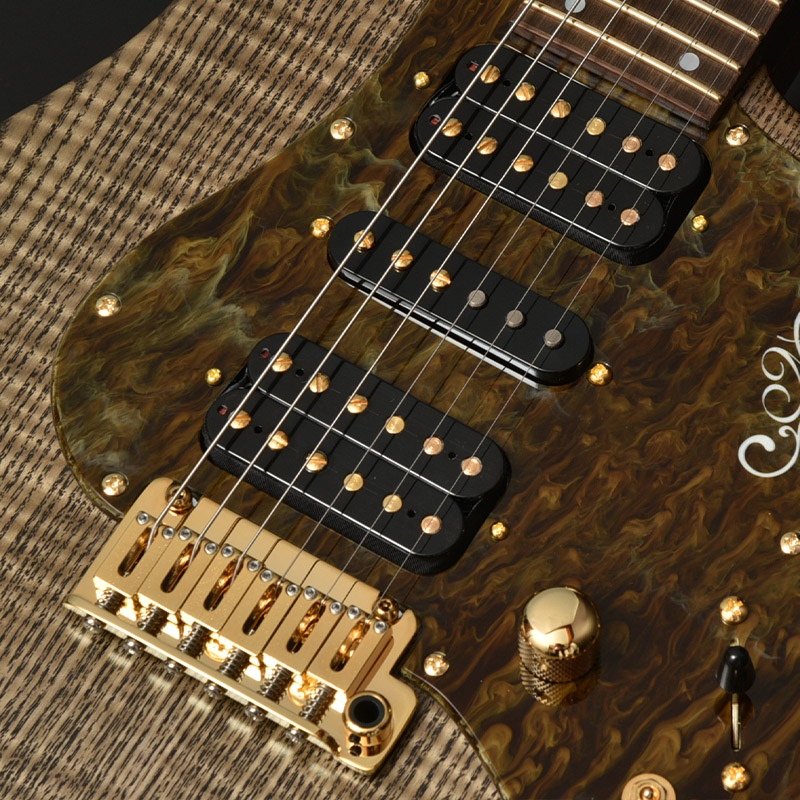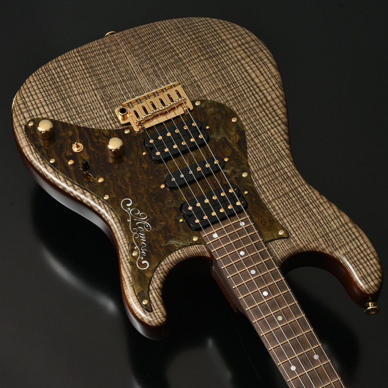 アメリカ、ノースカロライナ州のハンドワイアリングピックアップ、Mojotoneを搭載しております。フロント・リアポジションには、ドライブ時にもクリアでありながら太いサウンドが特徴的なPW Honet 、センターポジションにはシングルコイルの長所を活かしながら低音弦の出力を上げたTwo Face Stratを採用いたしました。この組み合わせにより、素朴なクリーントーンからヘビーなリードトーン、厚みのあるコードトーンなど幅広い音色を生み出しながらも低音はぼやけることなくタイトであり、高音も耳障りでなくバランスのとれたサウンドとなっております。