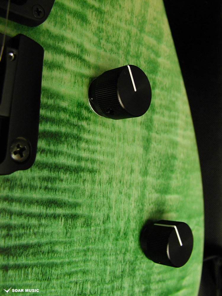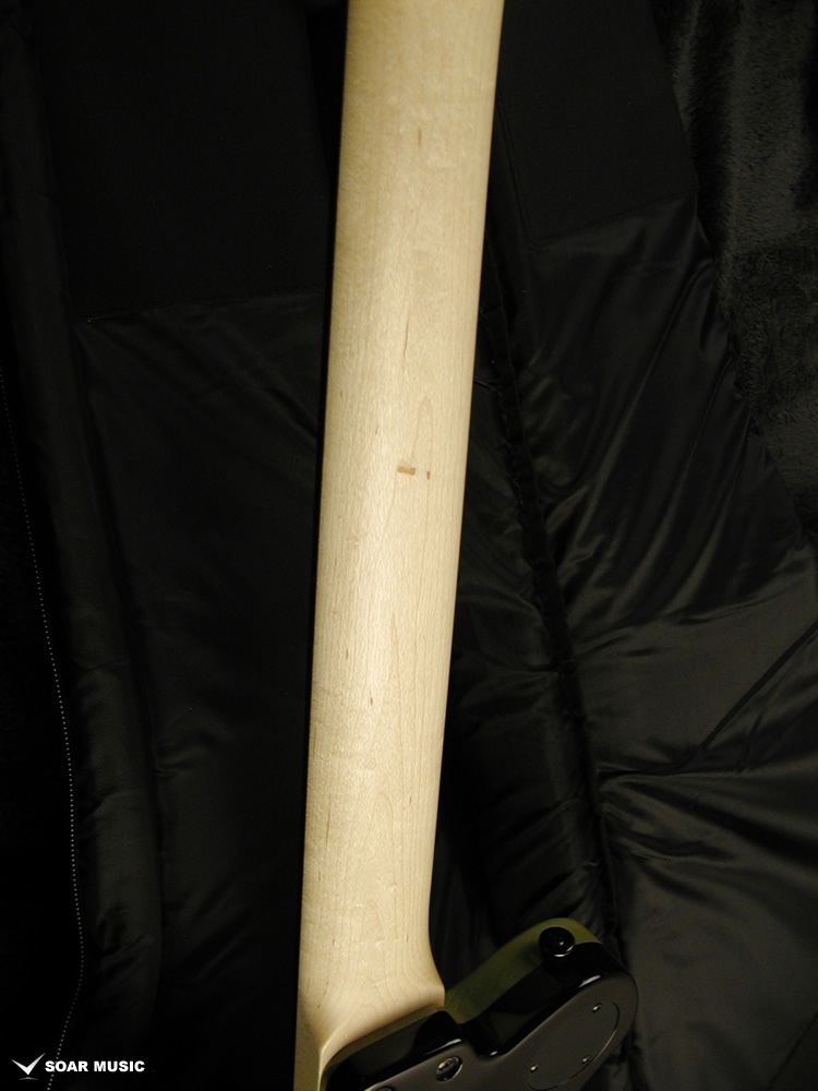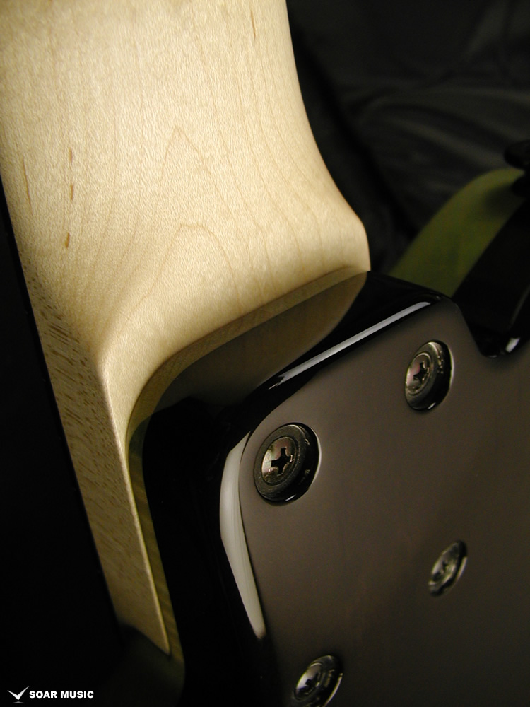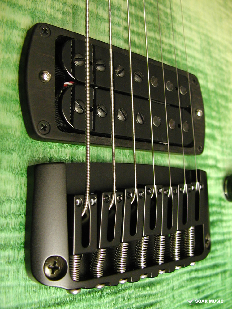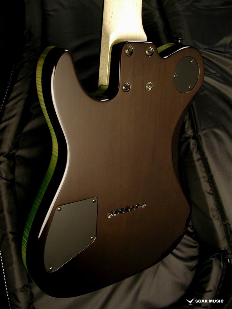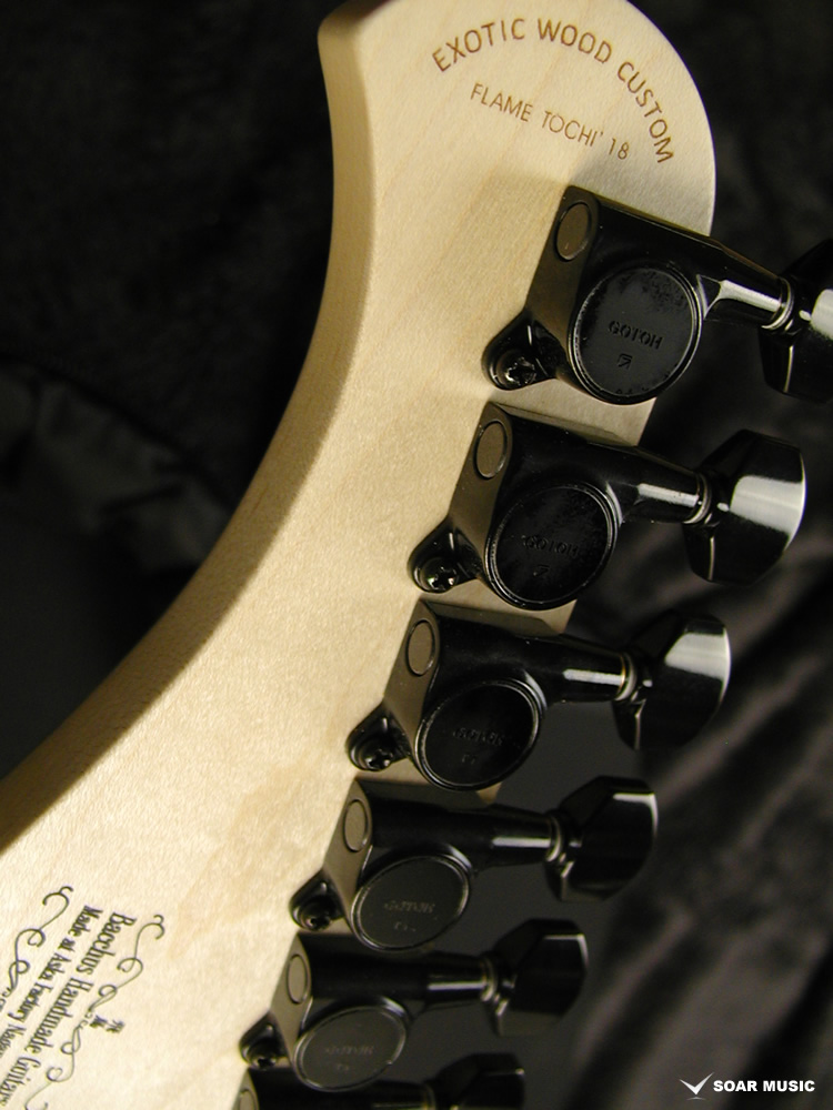 ボディトップには希少材”フレイムトチ”を採用。栃(トチ)の木は本州から北海道、九州に自生する落葉広葉樹です。古くから日本では家具材、建築材に使用されており、日本の木工家からの人気が高く一枚板のテーブルをはじめ大変高価で一級品と呼ばれる工芸品に生まれ変わります。通常のボディトップ材は5mm以下になることが一般的ですが、このモデルはフレイムトチとアルダーの1:1、いわば「ハーフ&ハーフ」で製作。極上の木材をふんだんに使用した、Bacchusならではの特別7弦モデルです。