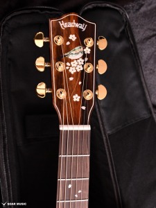 一方で、ヘッドと指板には白蝶貝やアバロンを用いて華やかな装飾を施しました。ヘッドに咲き誇る満開の桜から、桜の幹に見立てた指板上へと花びらが「零れ落ちていく」様子を白蝶貝で描き、おさむらいさんが思い描く桜の情景を表現しています。