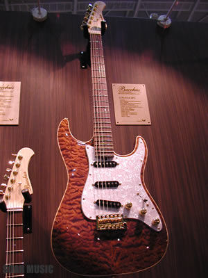 | 08モデルBacchusギターの旗艦、G-PLAYER SPCです。 BODY: Quilted maple(TOP),Alder(Back) Neck: Maple1P Fingerboard: Madagascar Rosewood Scale(Flet): 25 1/2inch(22F) Pickups: Dimazio HS-2(F&C),HS3(R) Control: 1Vol,Tone,blender,5way selector Width at Knut: 42mm Tuner: Gotoh SG360MG-01 Bridge: Gotoh 510TS-SF2 String: 010-046 Finish(Neck): Lacquer Satin Finish(Body): Lacquer Gross Color: TBR 定価: \315,000 |