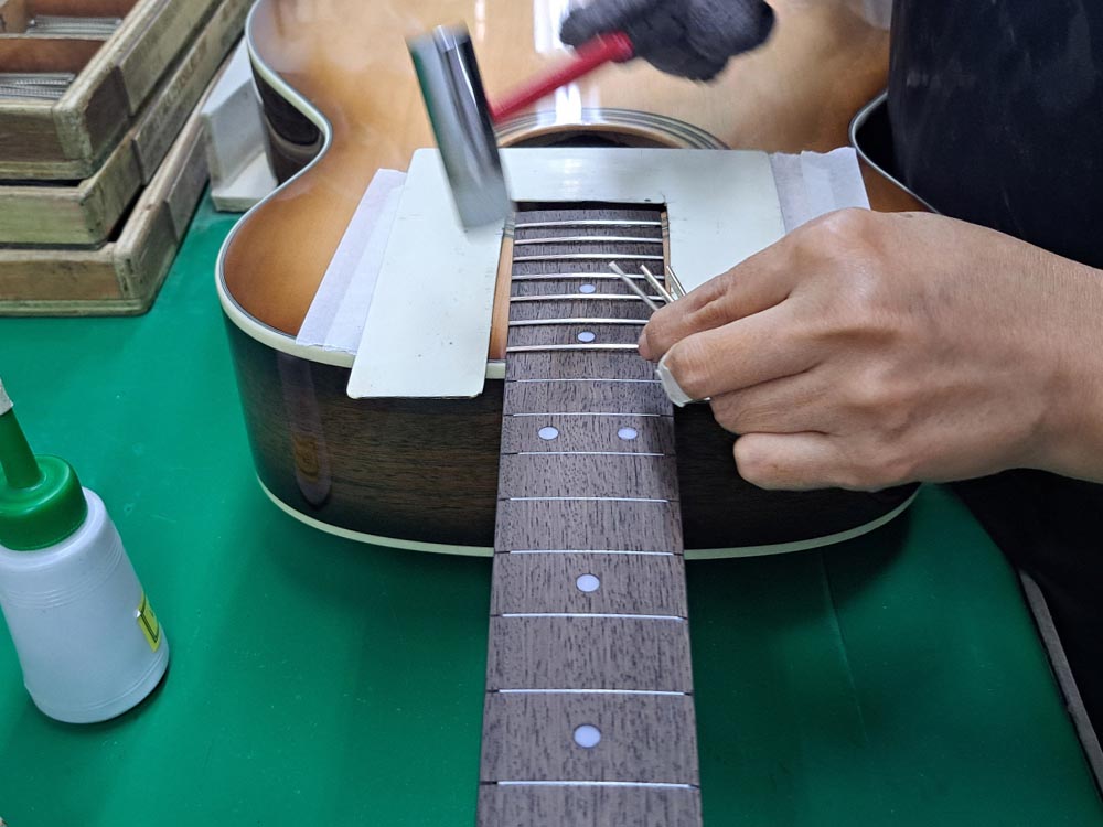 さらに、指板へのフレット打ち込みはボディとネックの接合後の組込行程時に行うことにより、フレットの高さのばらつきなどを極力抑え、安定した演奏性を届けます。