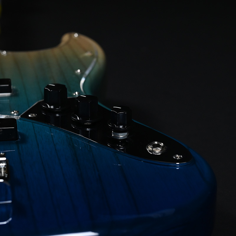 ボディ中心からボディエンド部分にかけての青の色調が、海の深さのような印象を想起させる「Blue-Gradation」。グラデーションカラーを余すことなく楽しんでいただけるよう、ピックガードにはクリア素材を採用しました。