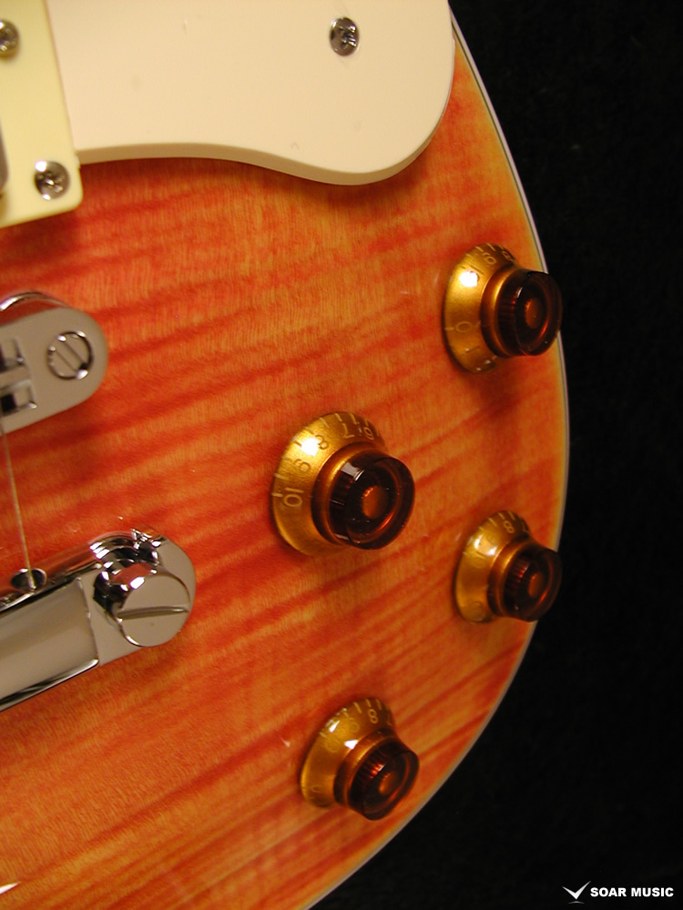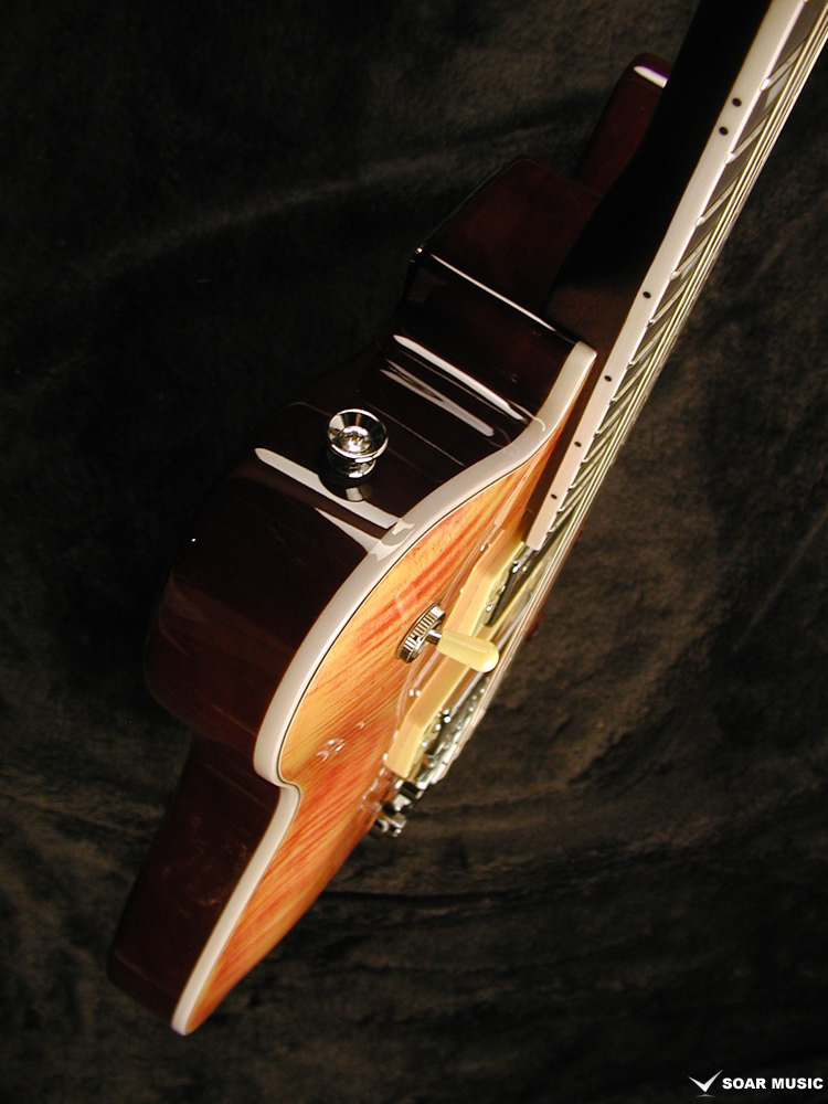 最大の特徴と言えるのがこのアーチ形状のボディトップです。フラットトップのエレキギターに比べて、よりトップ材の杢目やカラーが引きたてられたアイコニックなルックスを持ちます。