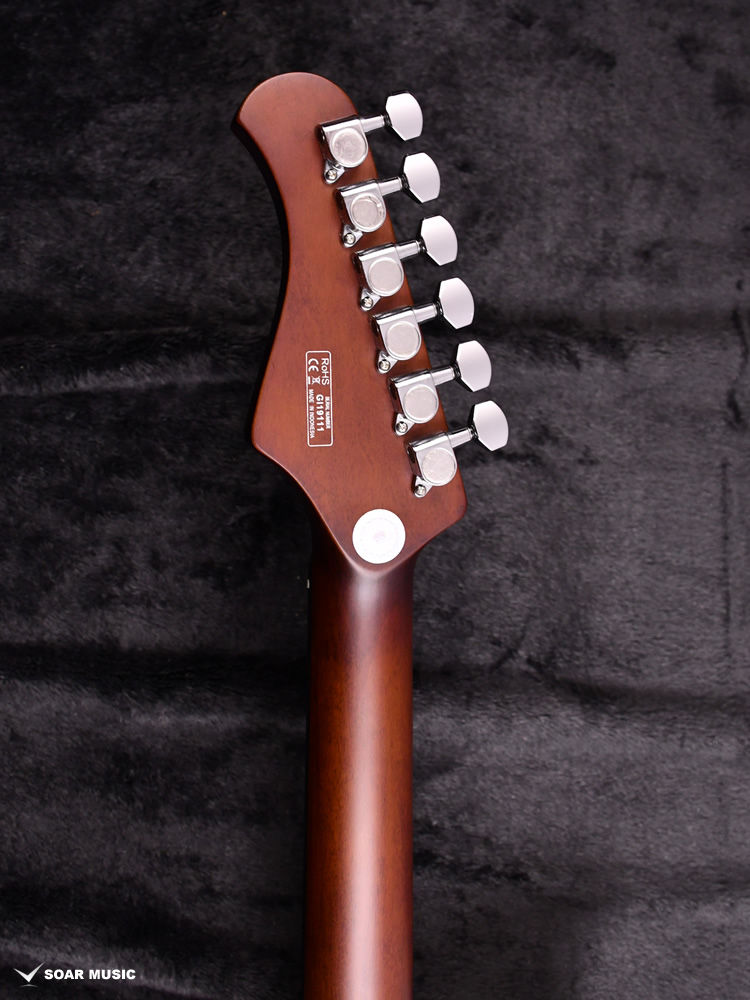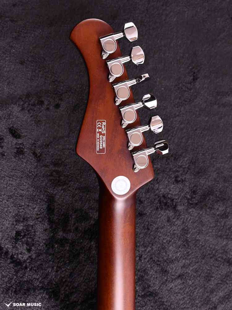 適度な重量を備えたナトーボディより、立ち上がって演奏する際にもバランス感の良さを発揮します。ボディ外周に施されたヘリンボーンスタイルのバインディングと落ち着いた雰囲気のカラーリングが特徴です。