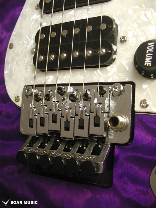 ブリッジにはロック式のトレモロブリッジが搭載されており、接点の少ない2点支持によるフローティングの状態とナット部分でしっかりと弦をロックする事でアーミングによるチューニングのずれを最小限に抑える他、より激しく深いトリッキーなアーム奏法が可能です。また、各弦で独立したサドルを設けることで、より細かなピッチ調整も可能にしています。ブリッジをはじめ、ペグやポットなどのパーツ類も限られた製作コスト内で精度と安定性を追求し、現地工房の日本人スタッフにより厳選されたパーツを採用しています。 |