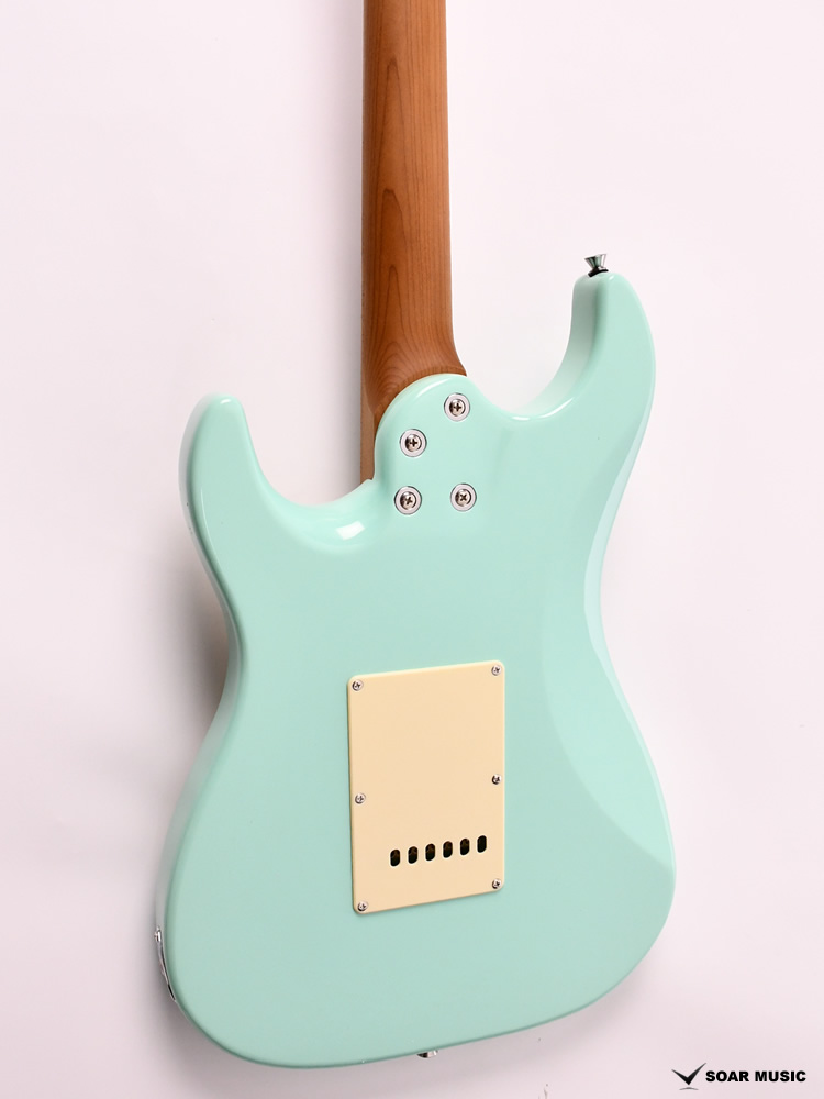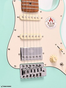 ローステッドメイプルとはメイプルを高温で加熱処理して材の中の水分や油分を揮発させることにより木材を経年変化した状態に人工的に近づけた材のことです。経年変化が進んだ材は歪みやねじれが生じにくくなります。ネックに使用されるとその効果は安定性だけでなくサウンドにも及び、豊かな生鳴りと経年変化したビンテージのようなこなれたトーンを生み出します。一般的に高級機種などで用いられる材ですが、手に取りやすい価格帯に落とし込むことに成功しました。
