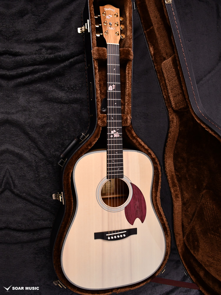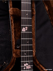 桜モデルを象徴する要素の一つとして、指板上にはアクリルと木材を使用して巧みに表現された桜のインレイが施されています。また、ピックガードには材の色が紫色であることが特徴のパープルハートが用いられました。
