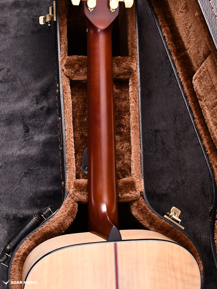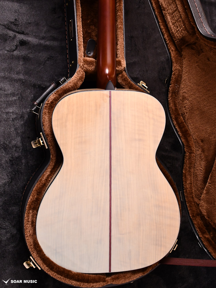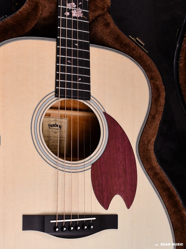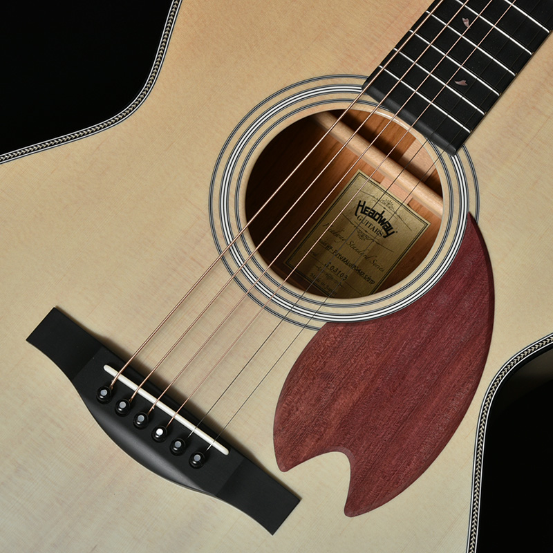 Headwayマスタービルダーの百瀬恭夫が1934年製のビンテージギターのブレーシングを研究し、独自に発展させたブレーシングを継承。Xのクロス位置がサウンドホールに近いセミフォワードシフトで新品時より低音の反応がよく、ボリュームのある鳴りを持ちます。フォワードシフトよりも5mmほどブリッジ寄りになっていることにより、トップ板の安定性も考慮された設計が行われています。
