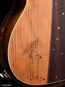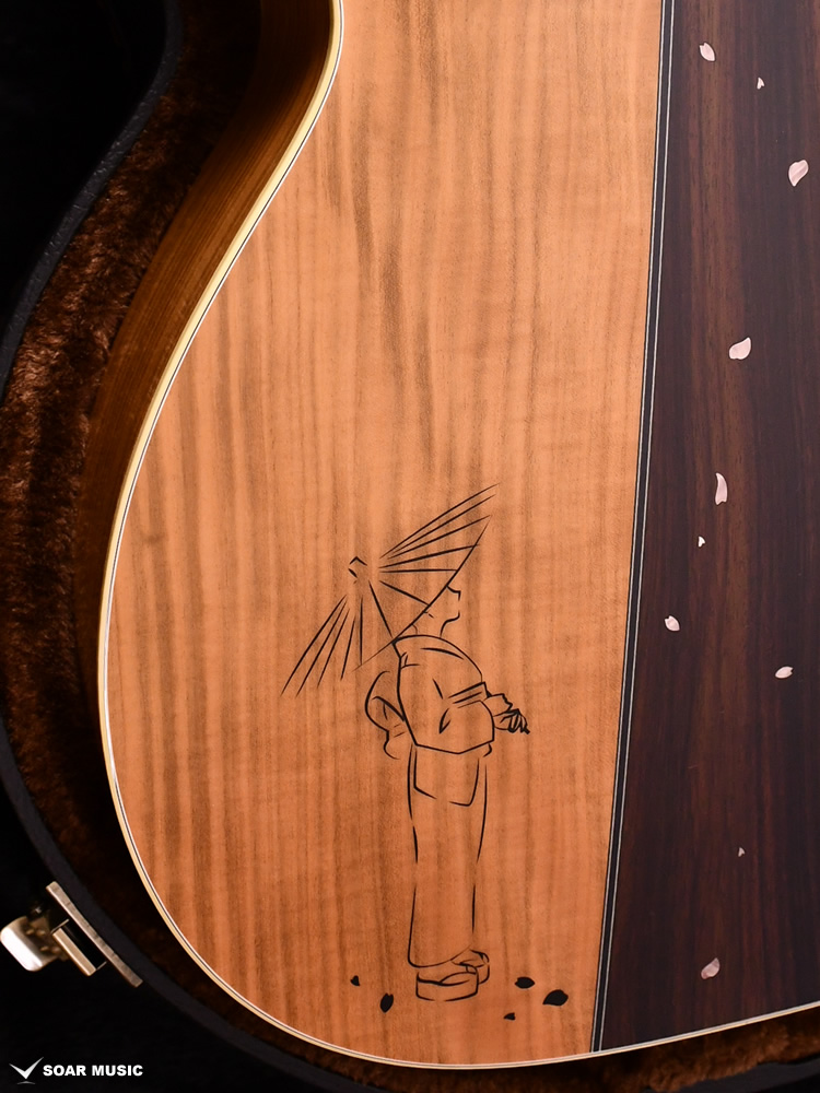 桜ギターの要ともなるサイド&バック材には、甘い音色とフレイム杢を兼ね備えた山桜(ヤマザクラ)が採用されています。バックではインディアンローズウッドをセンターピースに用いることで、いっそう華やかな仕上がりを目指しました。ボディの上部にはツバメの親子がインレイによって表現され、それを見上げる和傘の女性という春の日の一コマを切り取ったかのような美しい情景が描かれます。