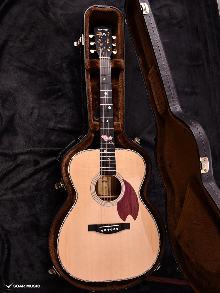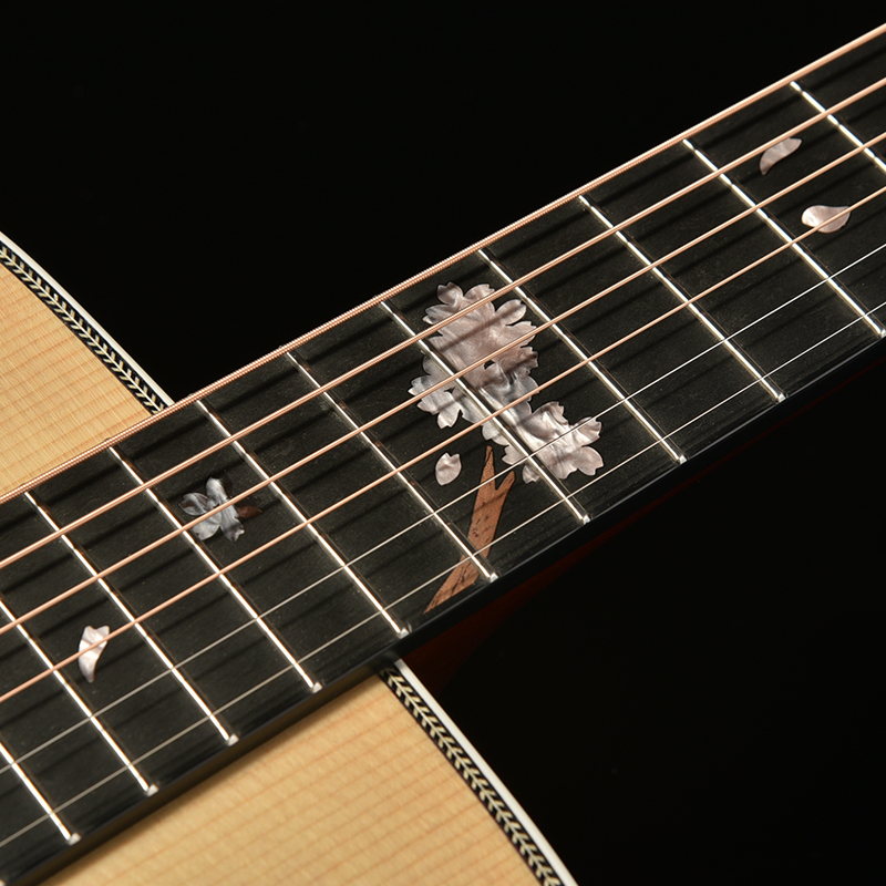 桜の花びらを模ったインレイが指板を美しく彩ります。通常のポジションマークをもつギターから持ち替えても違和感の少ないよう、演奏性にも配慮されたデザインです。