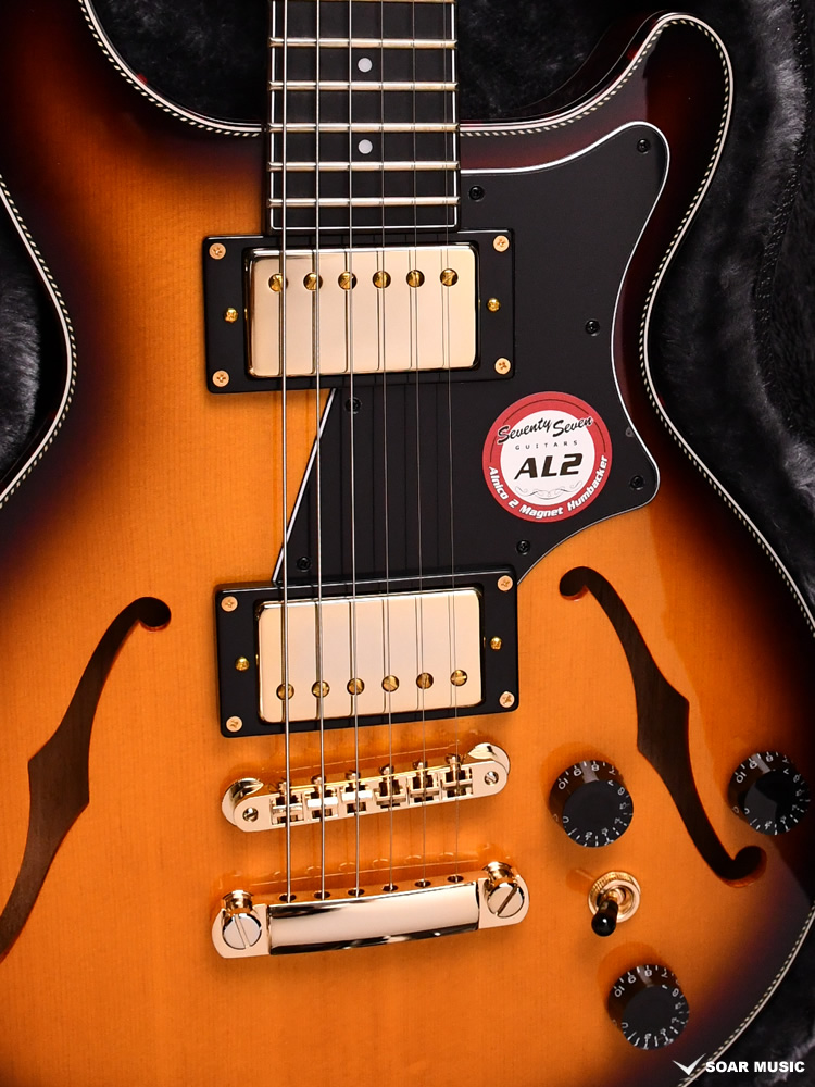 アルニコ2マグネットを採用したSeventySevenオリジナルピックアップ、 「SeventySeven AL2」を搭載。クリーントーンではきらびやかな鈴鳴り感を表現しつつも耳に痛くない暖かさを併せ持ち、ドライブをかけると歯切れの良いエッジの効いたクランチサウンドを出力します。プレイヤーの創造力を膨らませて豊かな演奏表現を生み出します。