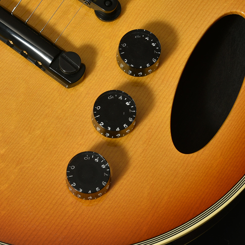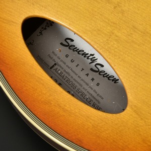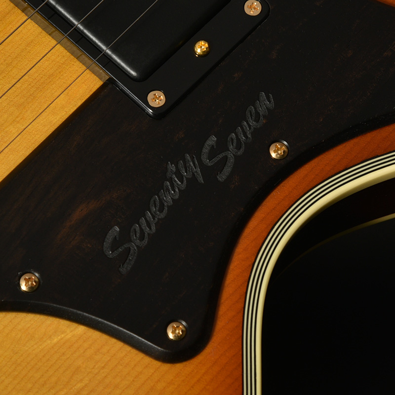 ピックアップにはMojotone×SeventySeven共同開発の “Classic 77Humbuker″ を標準搭載。セミホロウ構造とのマッチングを考え、磁力の弱いアルニコ2マグネットの採用、通常よりコイルのターン数を抑えた仕様となっています。クリーン、ドライブのどちらでもクリアな音が保たれ、引き締まったボトムエンドと豊かなサスティーンが特徴です。