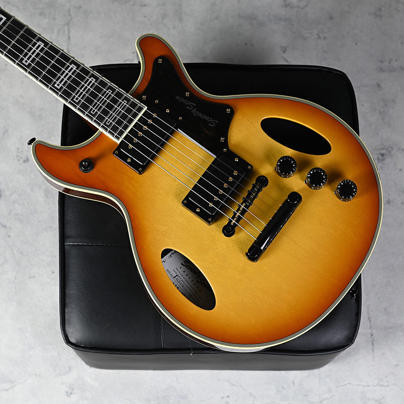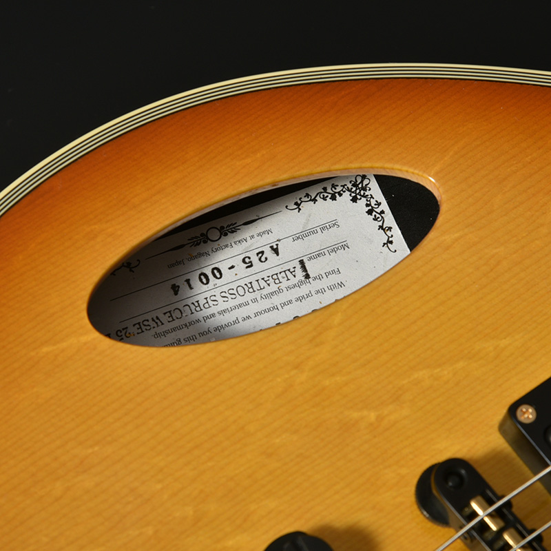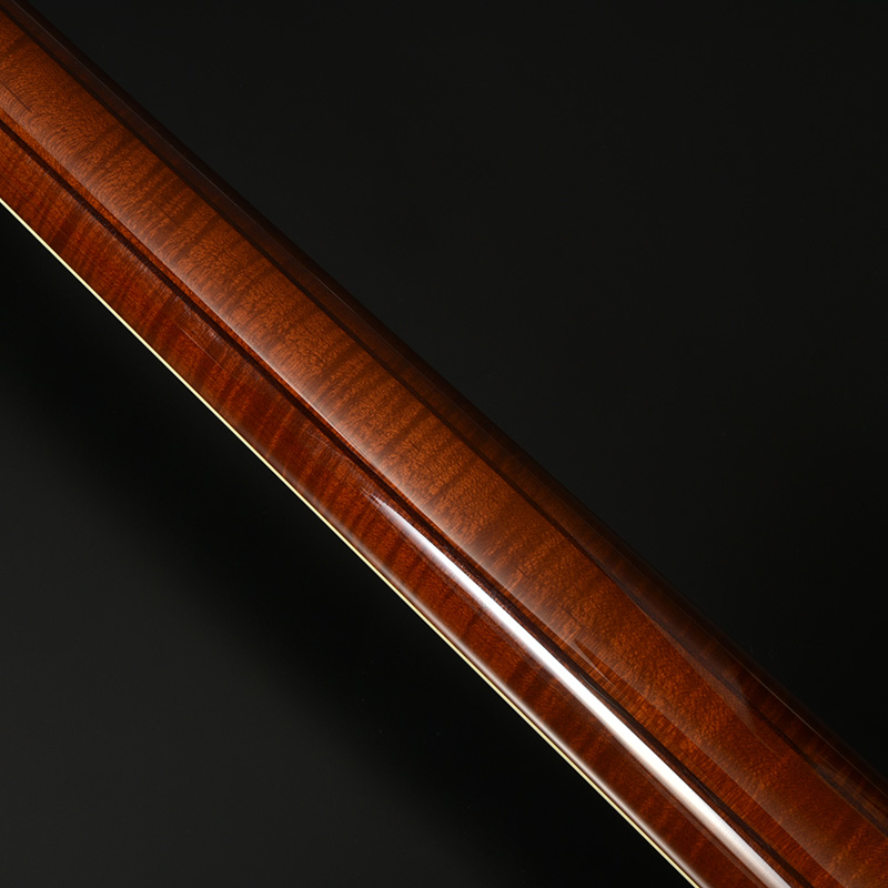 ボディトップにはアコースティックギターの材料として知られるスプルース材を使用。ホロウボディのALBATROSSにとって理想の音響特性を持った木材です。バック材としては、和材の中でも相性の良いトチを採用しています。中〜高音域にかけて抜けの良いサウンドを持つ木材で、アコースティックなトーンの中にもエレキギター然とした芯のあるサウンドを確立しています。 本機のカラーリングには温かみのあるIce Tea Burstを採用しました。より現代的デザインに仕上げるため、熟練の塗装技術による通常よりも細いバーストが用いられています。