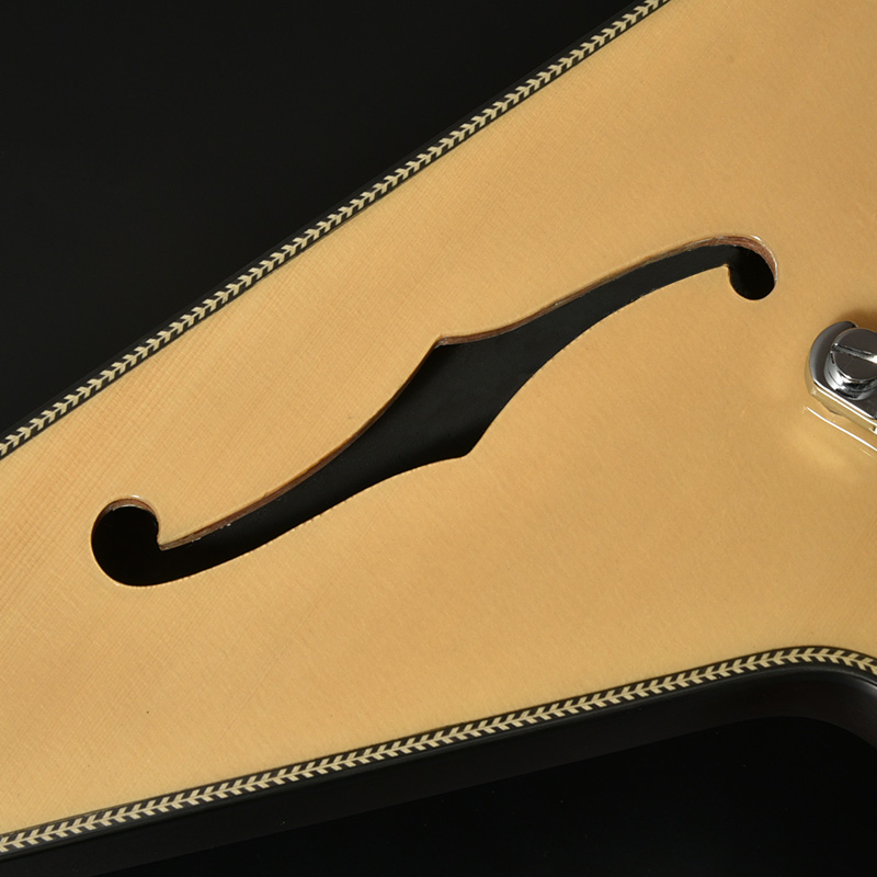 Fホールを有するセミホロウボディを採用した「BFV-JAZZ」。ボディのトップにはアコースティックギターでは定番のトップ材であるスプルースを使用。ナト―材のボディを可能な限り大きく掘り込むことによってボディ内部に広い空間が生まれ、そこから生まれる豊かなアコースティック・トーンが最大の魅力です。