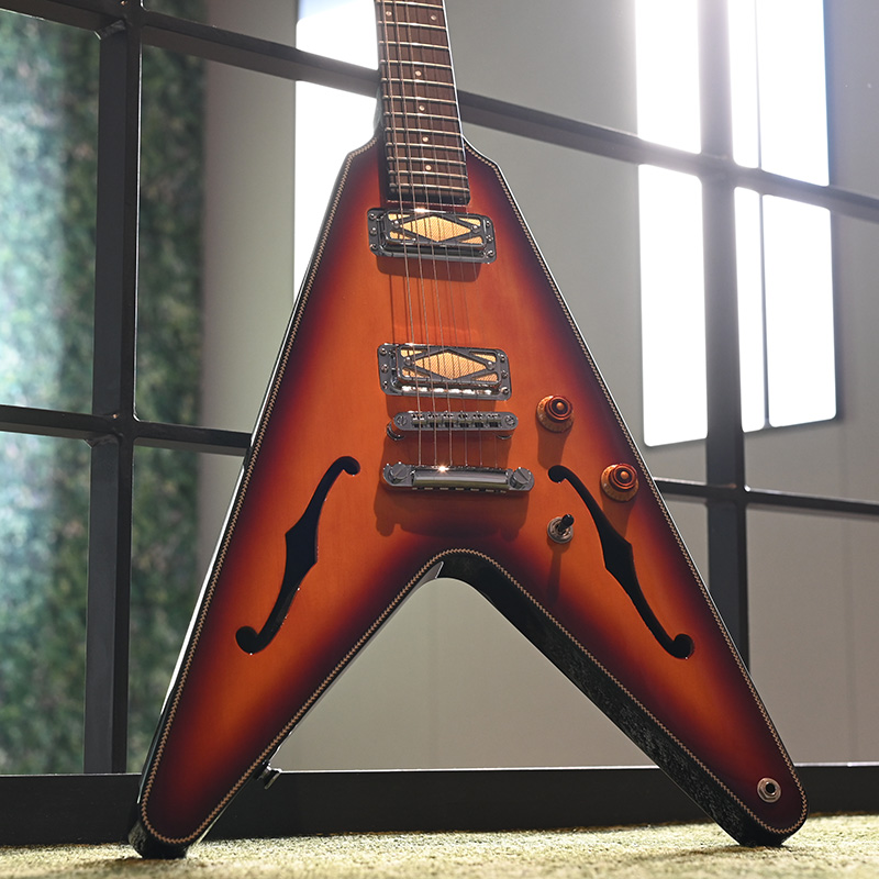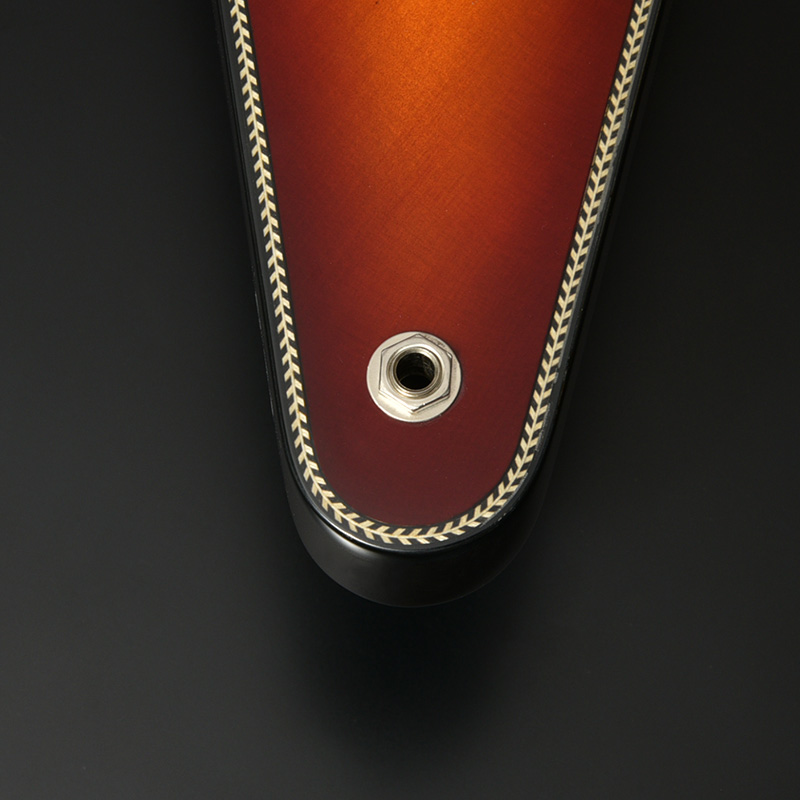 Fホールを有するセミホロウボディを採用した「BFV-JV」。ボディのトップにはアコースティックギターでは定番のトップ材であるスプルースを使用。ナト―材のボディを可能な限り大きく掘り込むことによってボディ内部に広い空間が生まれ、そこから生まれる豊かなアコースティック・トーンが最大の魅力です。
