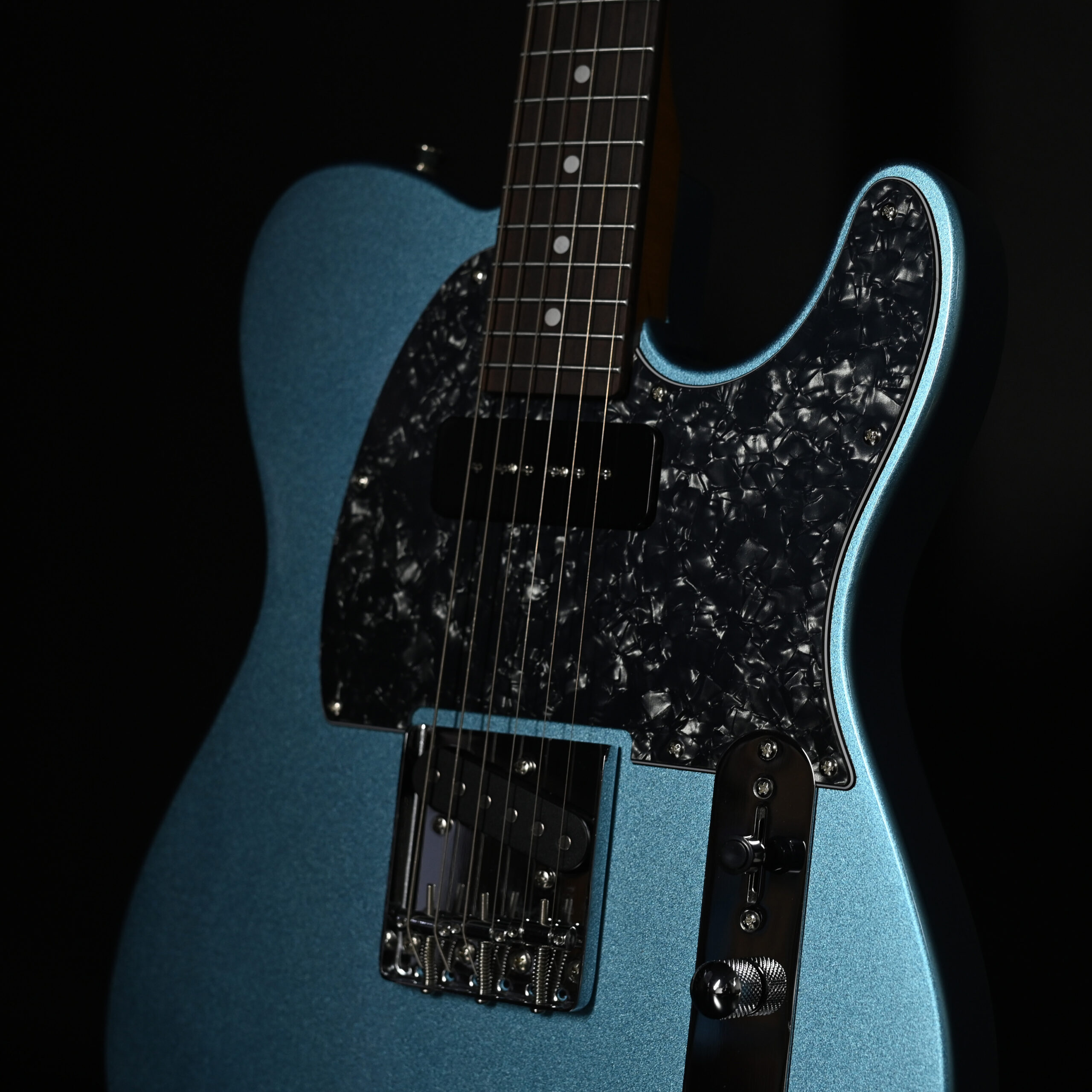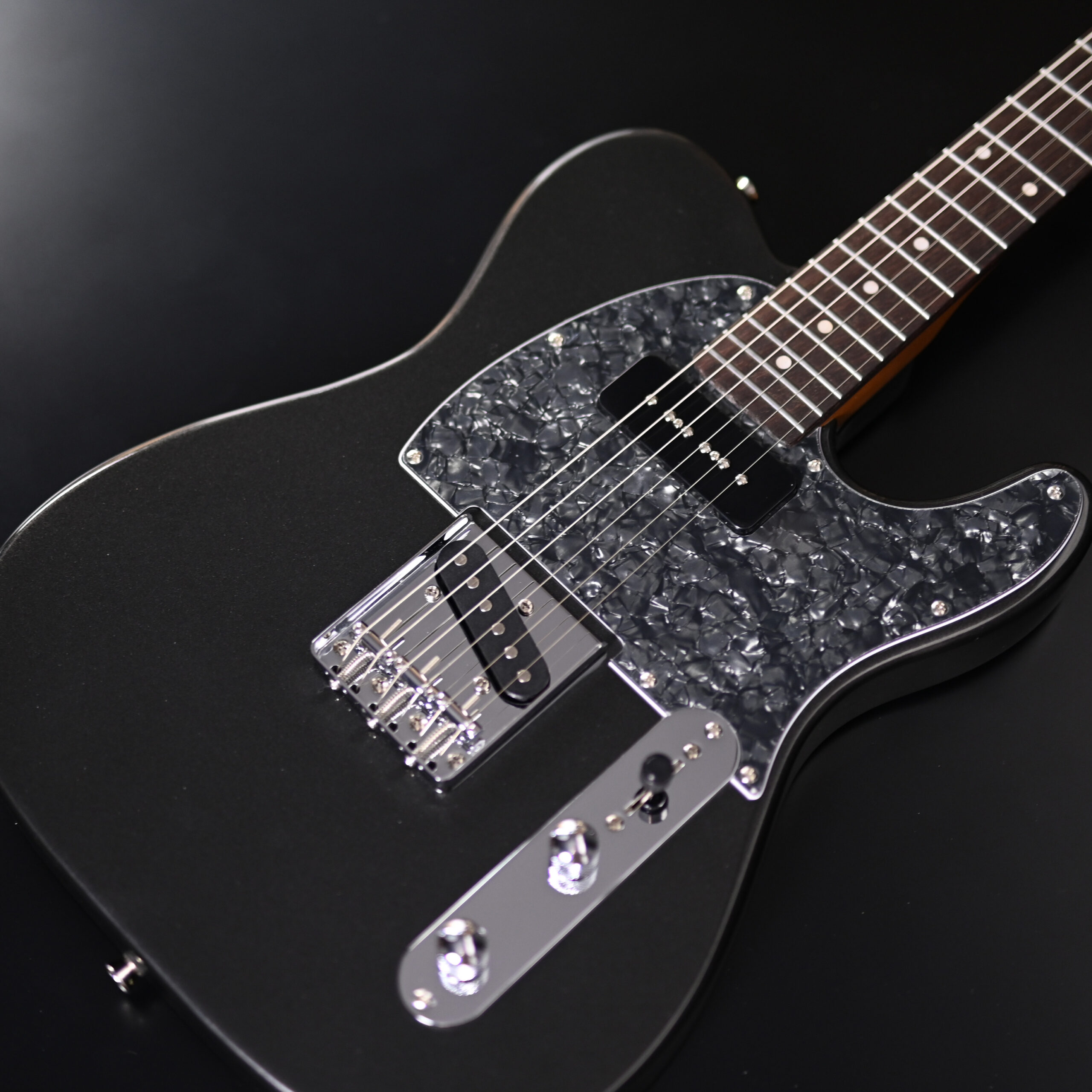 「ブラックパールピックガード」はその名のごとく、黒真珠の持つ白の光沢と気品ある黒色がもたらす表情をイメージしたピックガードです。その洗練された質感と重厚な存在感は、モデルに格調高い雰囲気をもたらします。