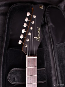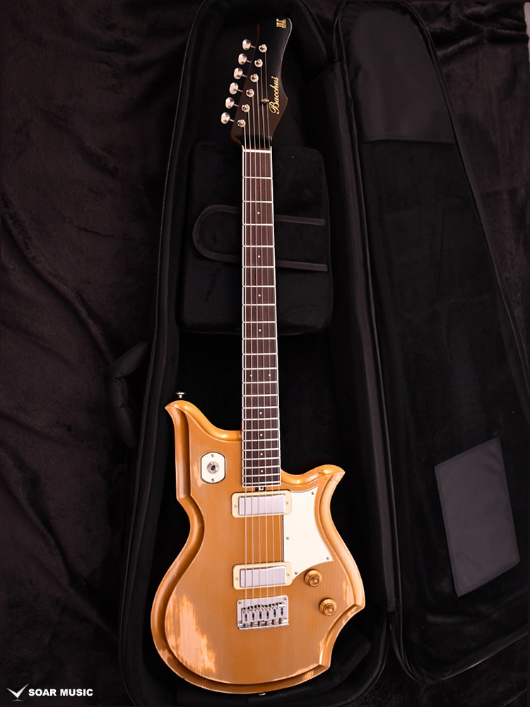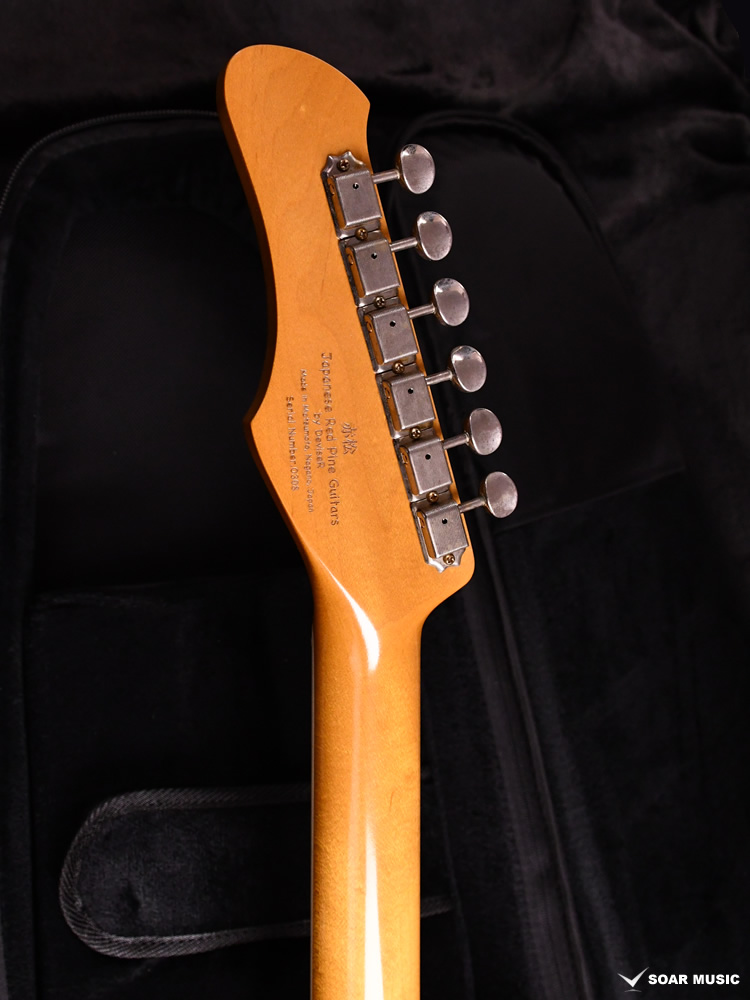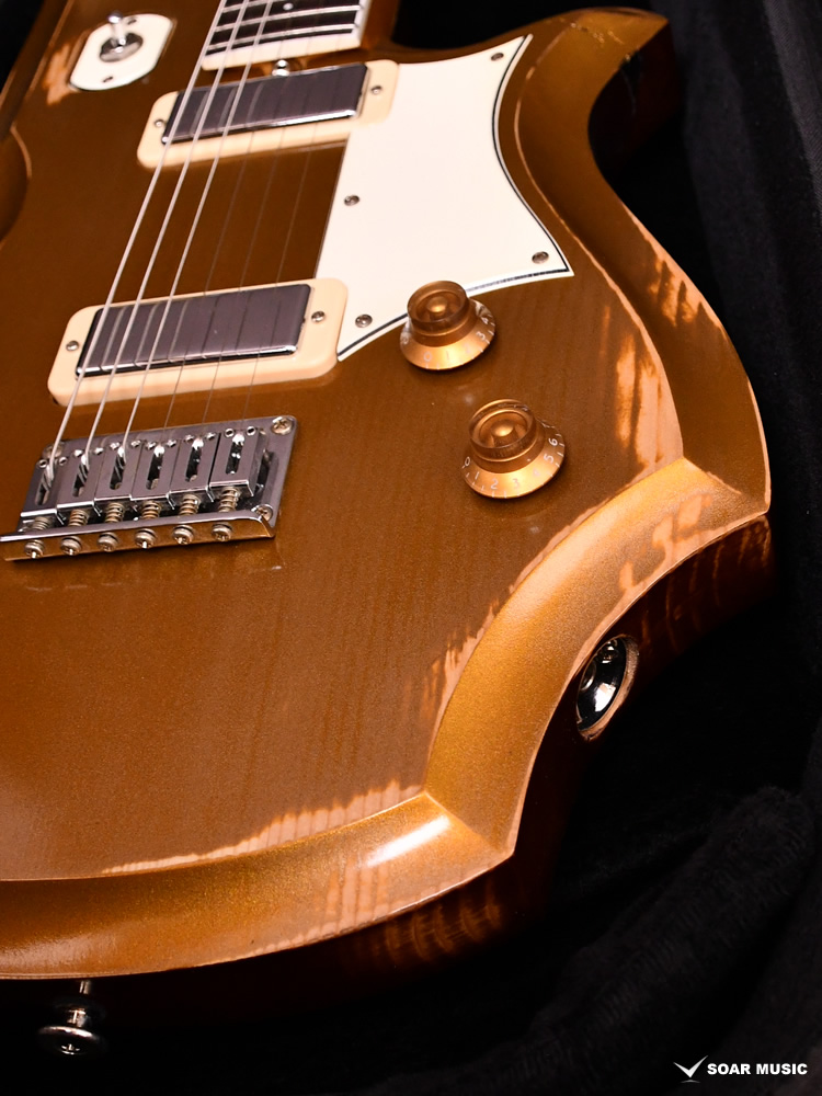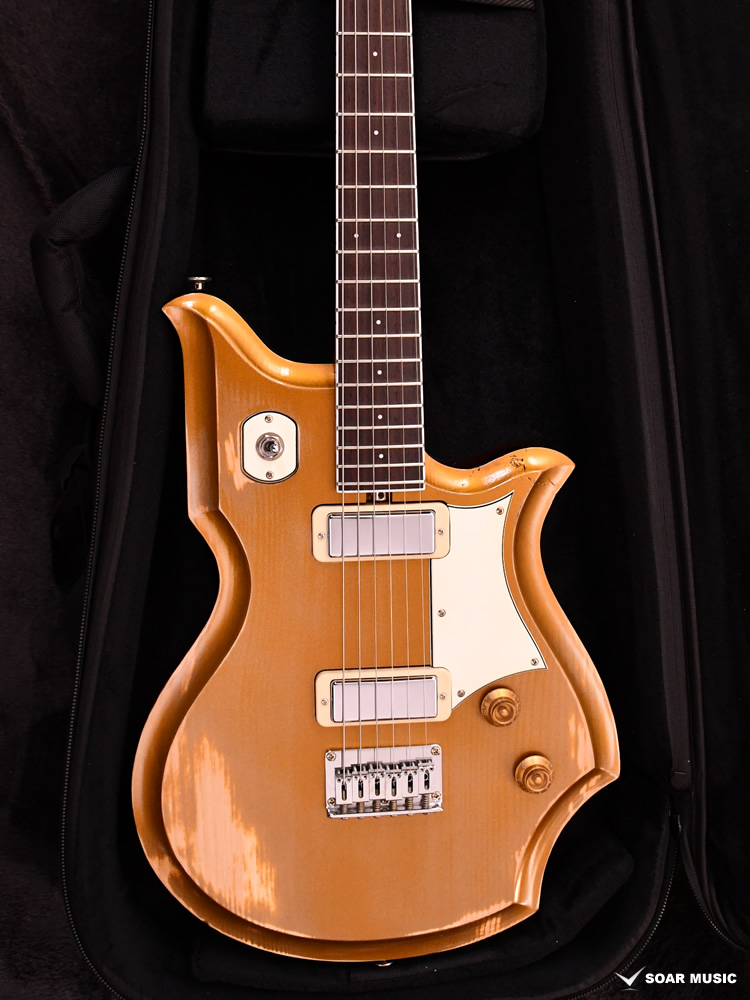 赤松の持つ節やシミなどをデザインへと昇華する、エイジド加工がボディとパーツに施されています。特別カラーとして、ビンテージ・ギターにインスパイアされたGold Topカラー、そしてブラックにフィニッシュされたヘッドストックが印象的な一本です。