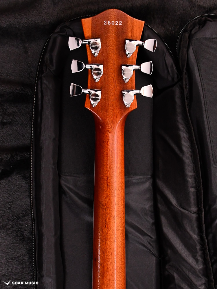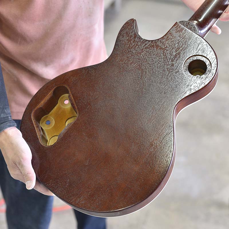 この塗装の技法として、着色層およびトップに使用されたラッカーの塗膜は一般的なグロス仕上げよりも薄く仕上げられており、ボディ材の振動を妨げることなく、木材本来の生鳴りを最大限に引き出します。