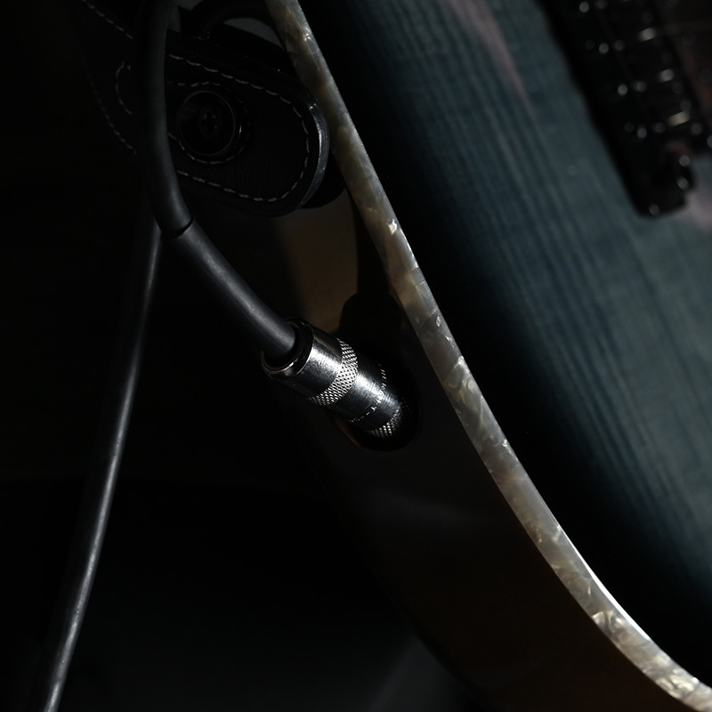 ストラップを用いた演奏時を想定した特注のジャック位置。シールドとジャックを、コンパクトにギターに接続することが可能になりました。