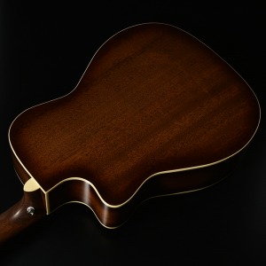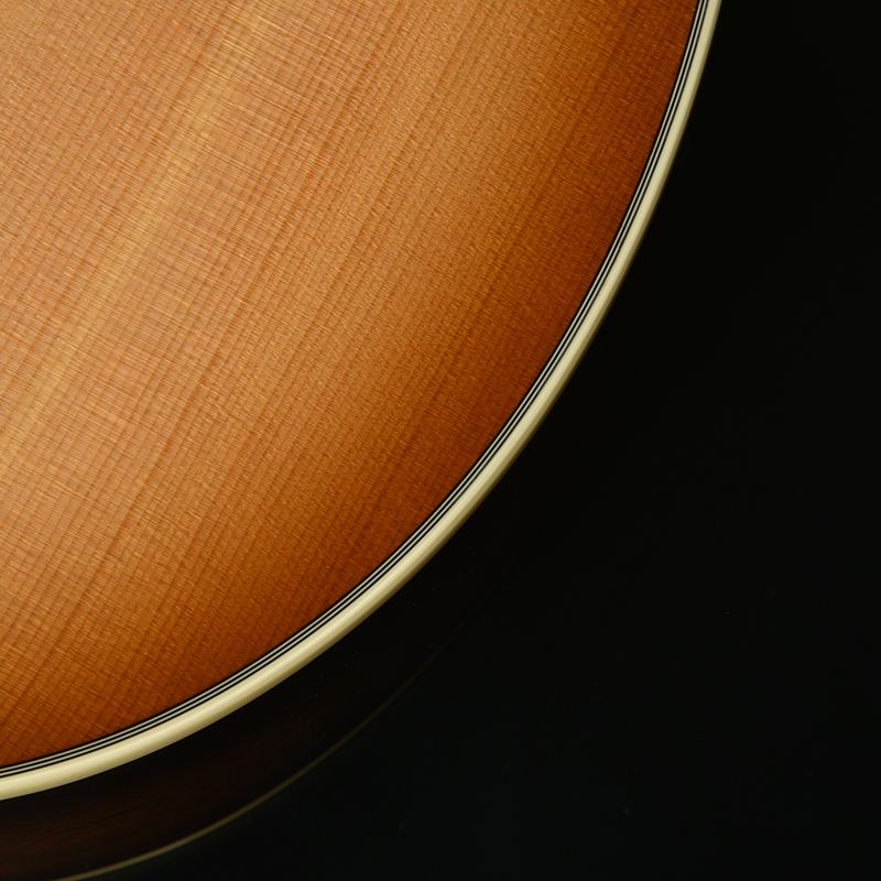 琥珀(Ambder)の色味をイメージした、暖かみのあるトーンのバーストカラー。 バースト部分の幅を狭くすることにより、洗練された印象にまとめました。ボディのサイドと裏側にも同色のバーストを施し、統一感のあるルックスに仕上げています。