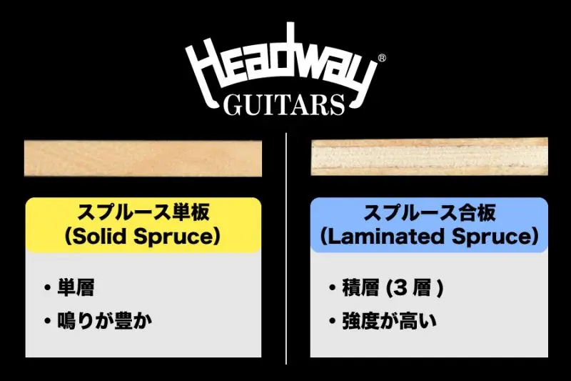 「単板」とは、複数の板を重ねて貼り合わせたものではなく、一本の木材からそのまま切り出した板を指します。貼り合わせて作られる「合板」と比べると、単板は振動が伝わりやすく、より自然で豊かな響きを生み出すのが特徴です。Essential Editionでは、サウンドに大きな影響を与えるボディトップに単板を採用し、Headwayが大切にしてきた「鳴りの良さ」を追求しました。
