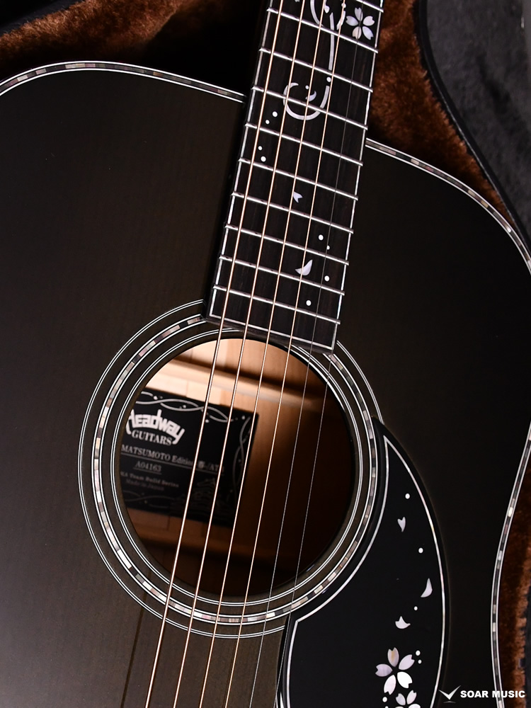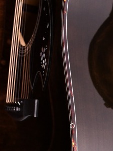 桜ギター一番の特色であるボディサイド・バックの桜材は特有の中音域に特徴のある私達が”桜サウンド”と表現する音色を聞かせます。さらにボディバックセンターに同じく和材のカエデ材を使用し、松本城のお掘をイメージした、四季と優雅に泳ぐ鯉をデザインしています。