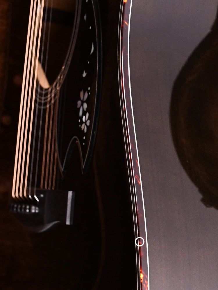 ボディのカラーリングは松本城の天守をイメージした”黒”で仕上げました。桜材の杢目を見せる黒の色合いは表現が難しく、数々のギターを塗り分けてきた職人の技と感覚で調色されています。