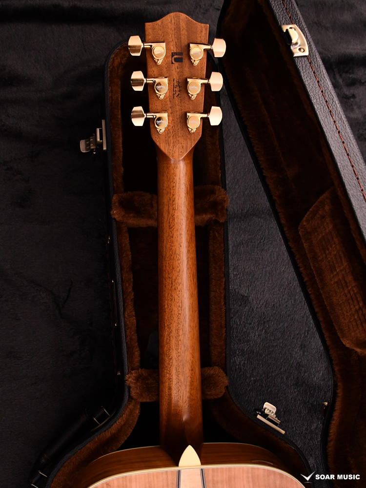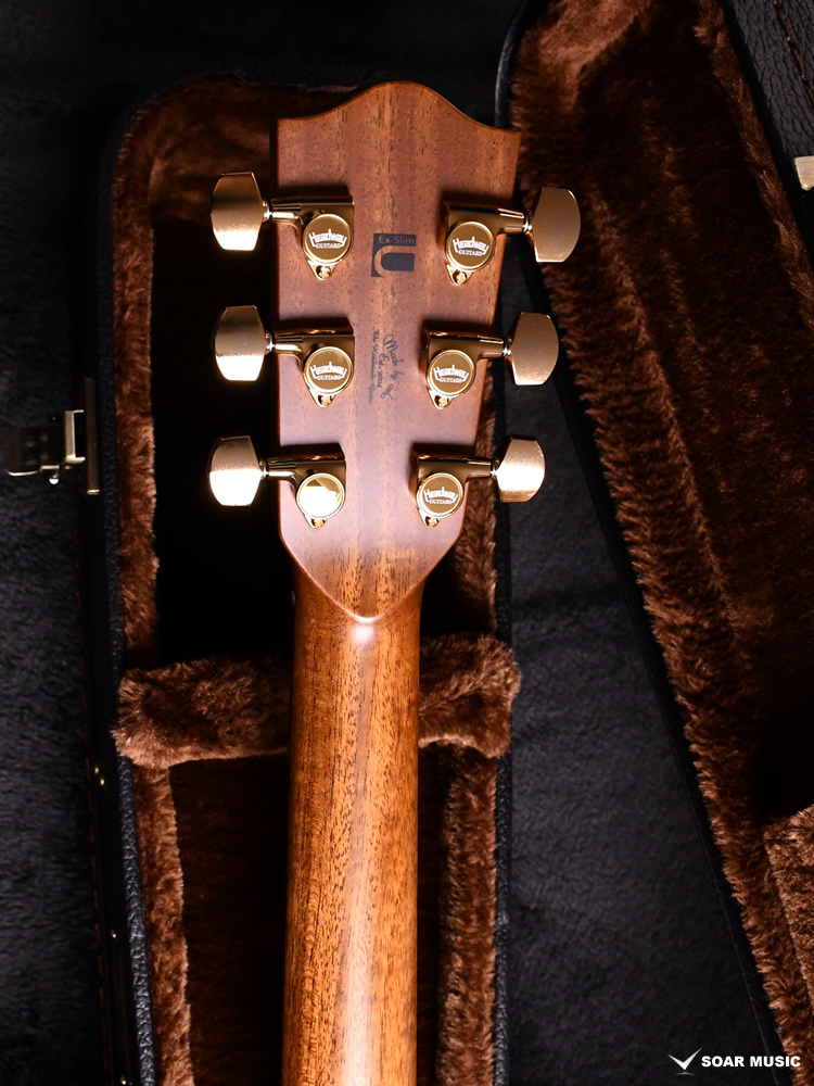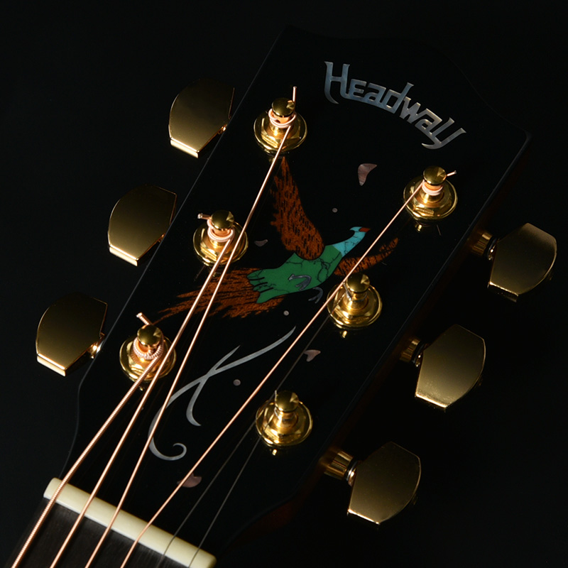Headwayマスタービルダーの百瀬恭夫が1934年製のビンテージギターのブレーシングを研究し、独自に発展させたブレーシングを継承。Xのクロス位置がサウンドホールに近いセミフォワードシフトで新品時より低音の反応がよく、ボリュームのある鳴りを持ちます。フォワードシフトよりも5mmほどブリッジ寄りになっていることにより、トップ板の安定性も考慮された設計が行われています。