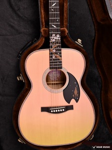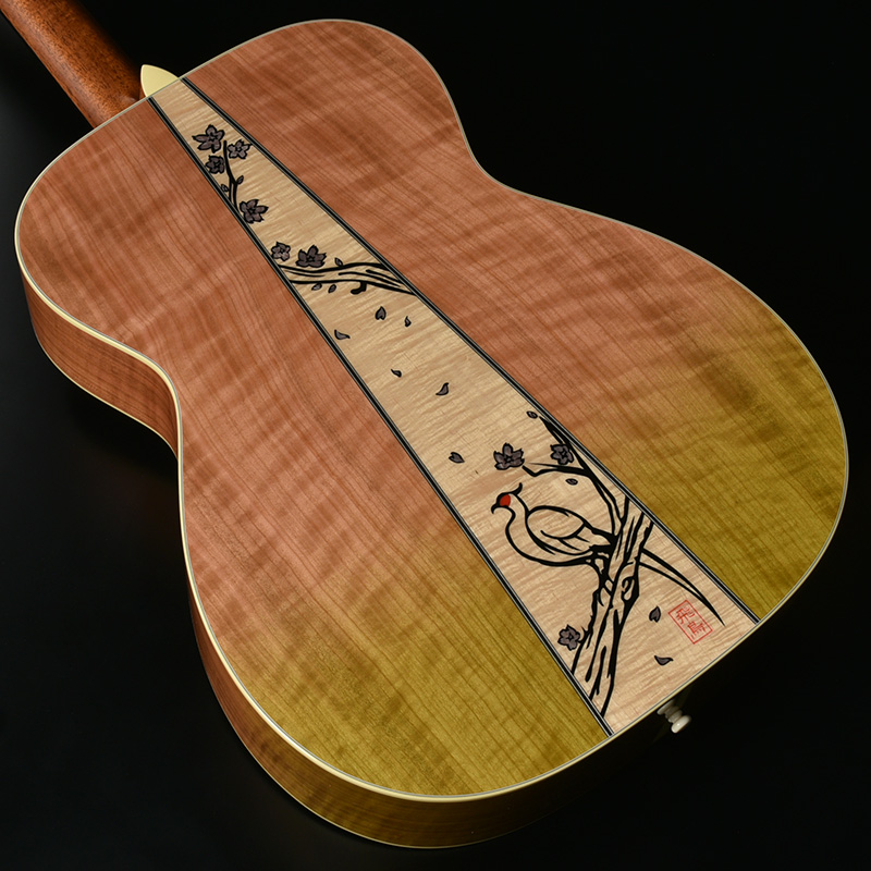 カラーリングは桜の杢目を引き立てる淡い桜色と春の芽吹きを感じる若草色をグラデーションで表現しています。異なる2色を組み合わせることは繊細な塗装の塗り分けと重なり合う部分の色の表現がキーポイントとなる為、数多の桜ギターを塗り分けてきた塗装職人の技が光るカラーリングです。