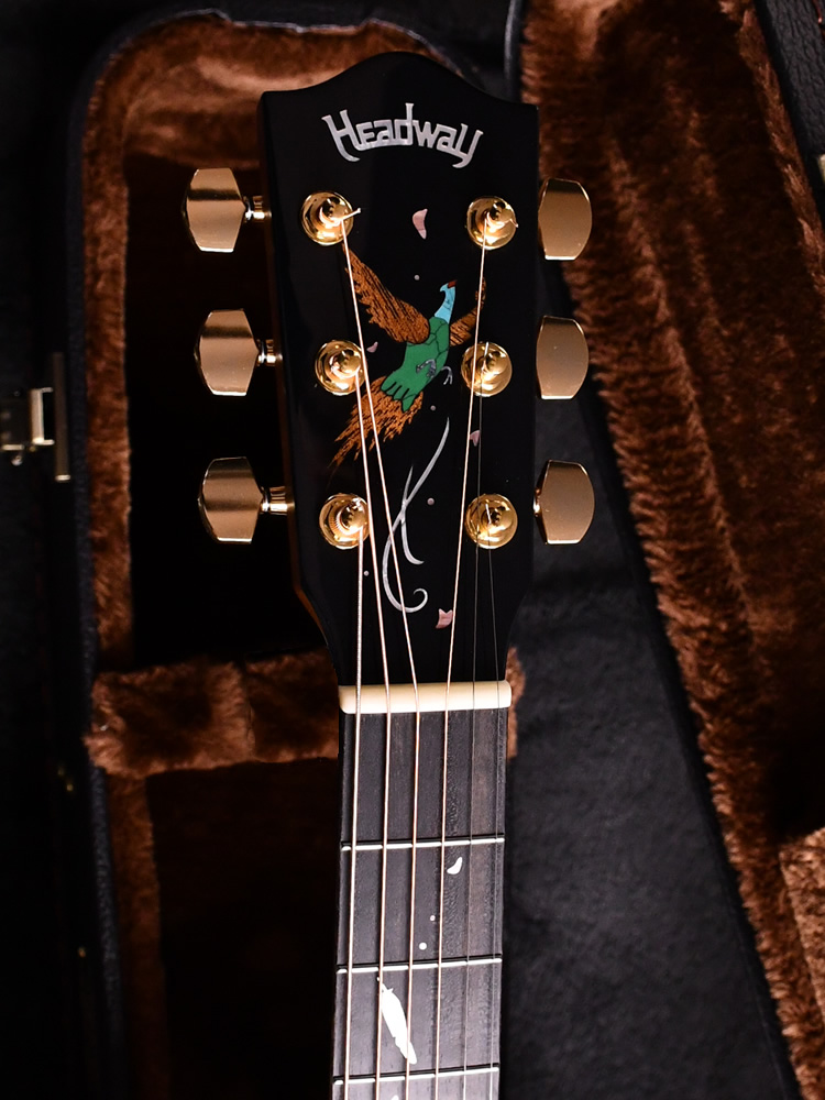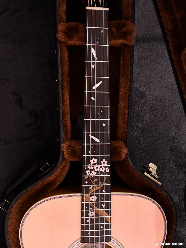 エボニー材の指板にて、インレイワークで桜の花とキジの羽がデザインされています。キジのテーマに合わせた和のテイストを目指し、天然貝や木材など複数の素材を使い分け製作しました。美しい桜の幹と花びら、そして舞い落ちるキジの羽を表現しています。