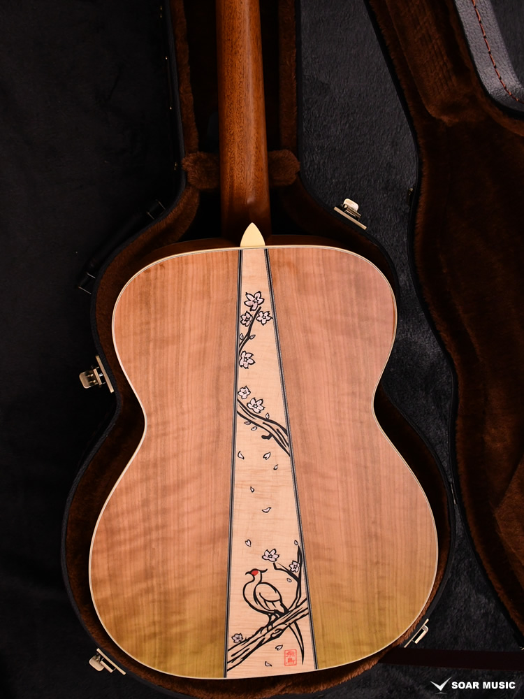 ボディバックのセンターは墨で描かれた掛け軸をイメージしております。単に塗装で墨絵風に表現するだけに留まらず、桜の花にはインレイを埋め込むなど複数の技法を組み合わせることで生まれた奥深さがあります。ファクトリーの「飛鳥」も押印されており、これは職人が1本1本手作業で押印している為、僅かな個体差が手に取った1本だけの特別感を演出します。