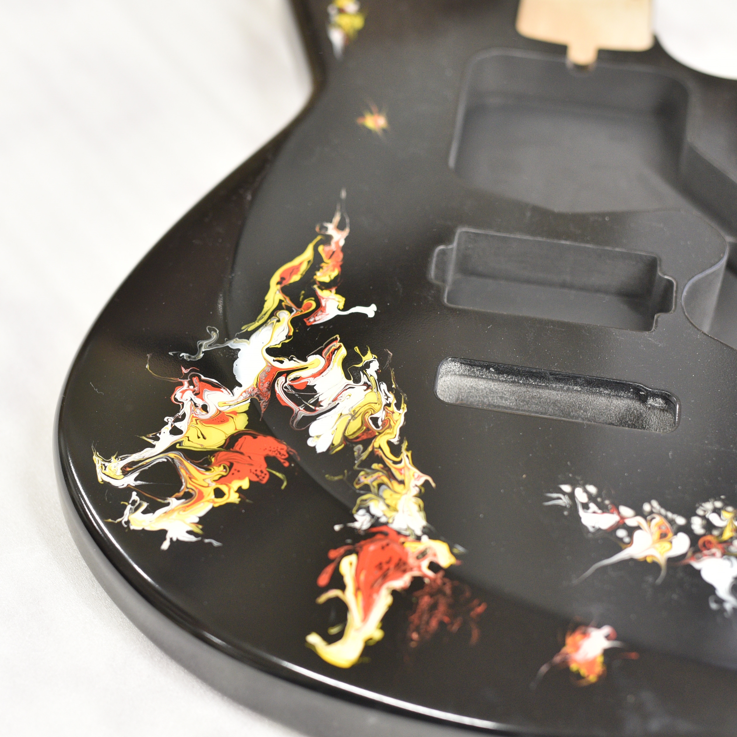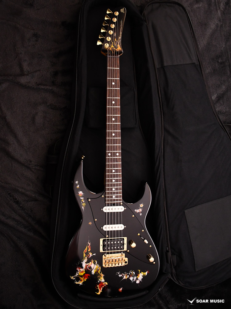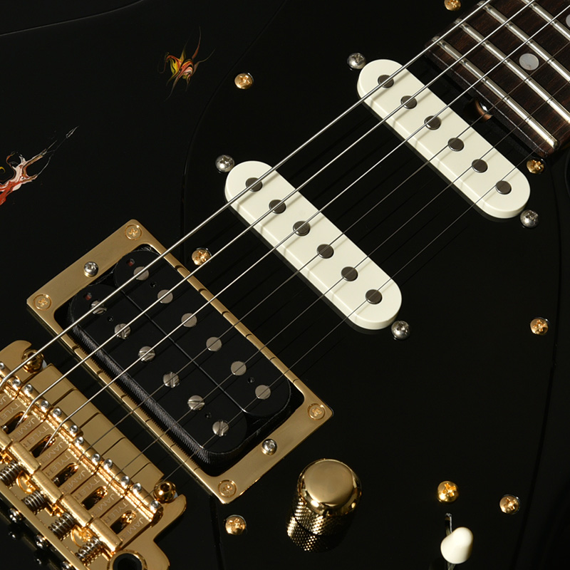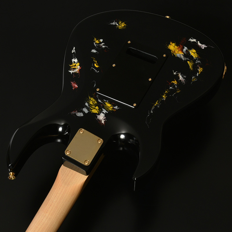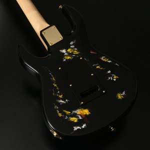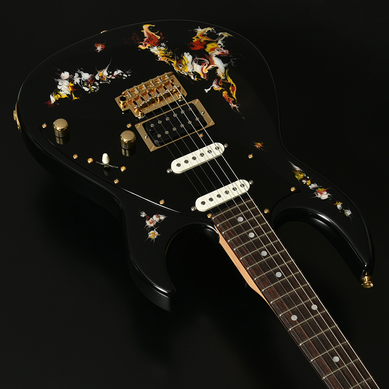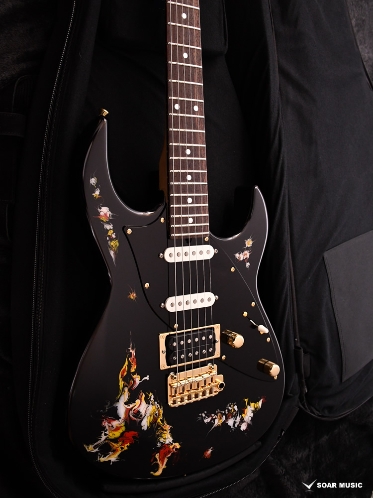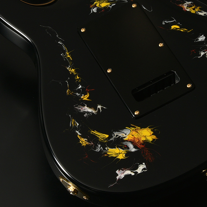 水中に絵の具を垂らした瞬間に広がる流線模様で描く「フルイドアート」と呼ばれる技法に着想を得て、飛鳥の塗装職人が独自の手法で仕上げた一本。フルイドアートの技法を応用し、日本画を想起させるような繊細な線や筆の運びをイメージ。ボディトップのコンター部分には暗闇の中で燃えさかる炎にも似た印象のデザインとなり、唯一無二の1本として完成しました。ボディバックとヘッドトップにも同様の塗装が施され、実機全体にこの流線による繊細な意匠が広がります。