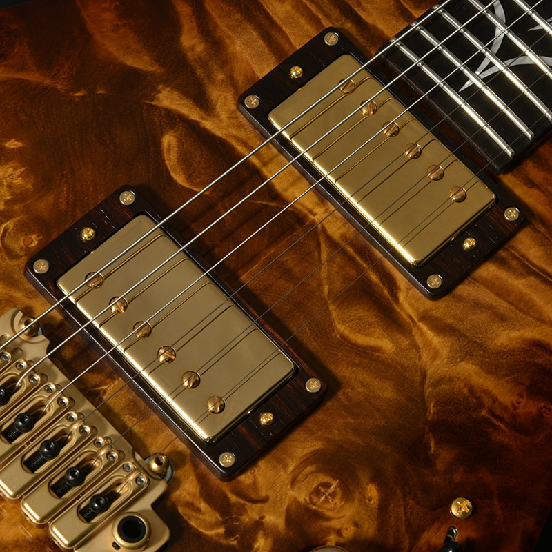 現在最も入手困難な木材のひとつブラジリアンローズウッド(ハカランダ)を指板とピックアップエスカッションに使用しています。指板上にはフラワーインレイが施され、その唯一無二の美しさをさらに際立てています。