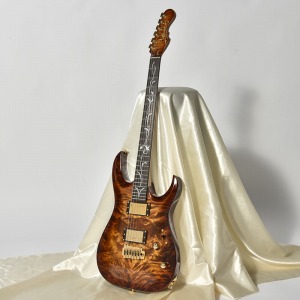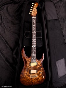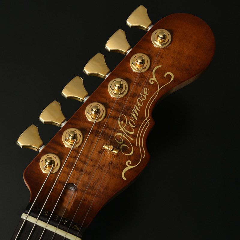 アーチトップが特徴的な新シェイプ”MA” (Momose Advanced)に、極上の和材フレイムトチを採用した特別な一本が登場。その見た目のみならず、H-H配列のピックアップ、2点支持トレモロ、24F仕様、ジョイント部分のヒールレスカット、そしてコイルタップ機能と言った現代のミュージックシーンを意識した仕様を数多く取り入れたモダンスタイルが特徴です。