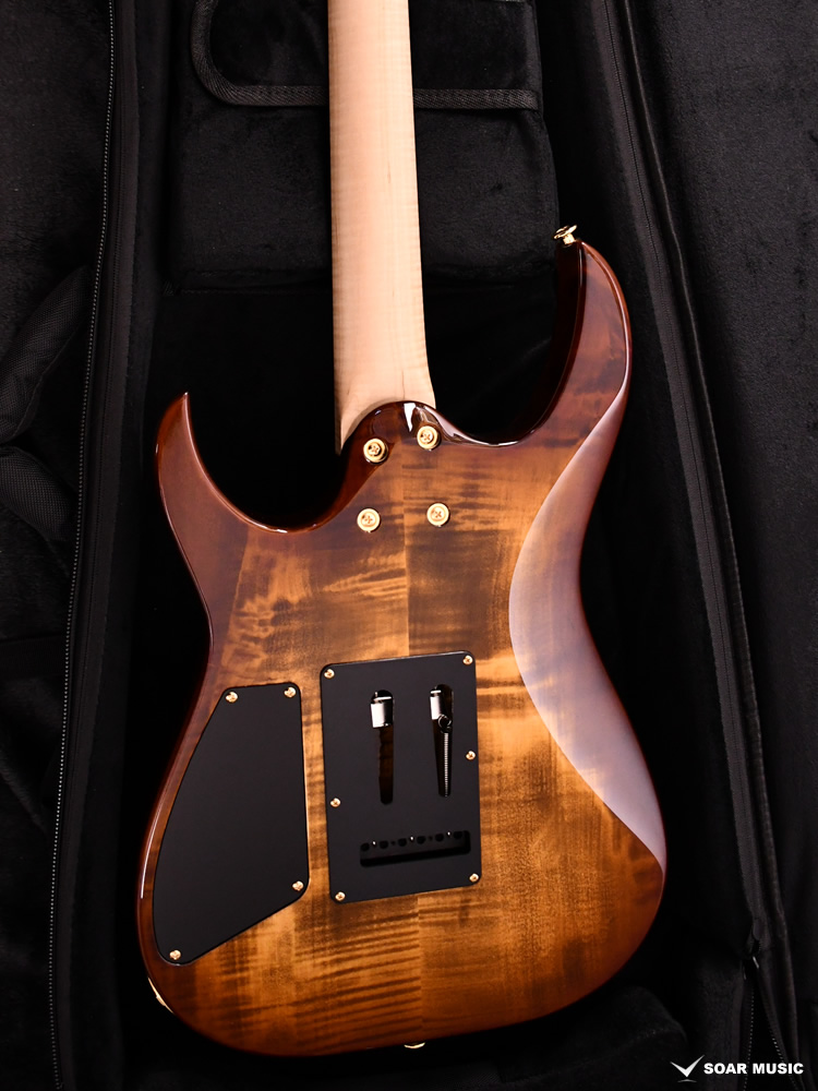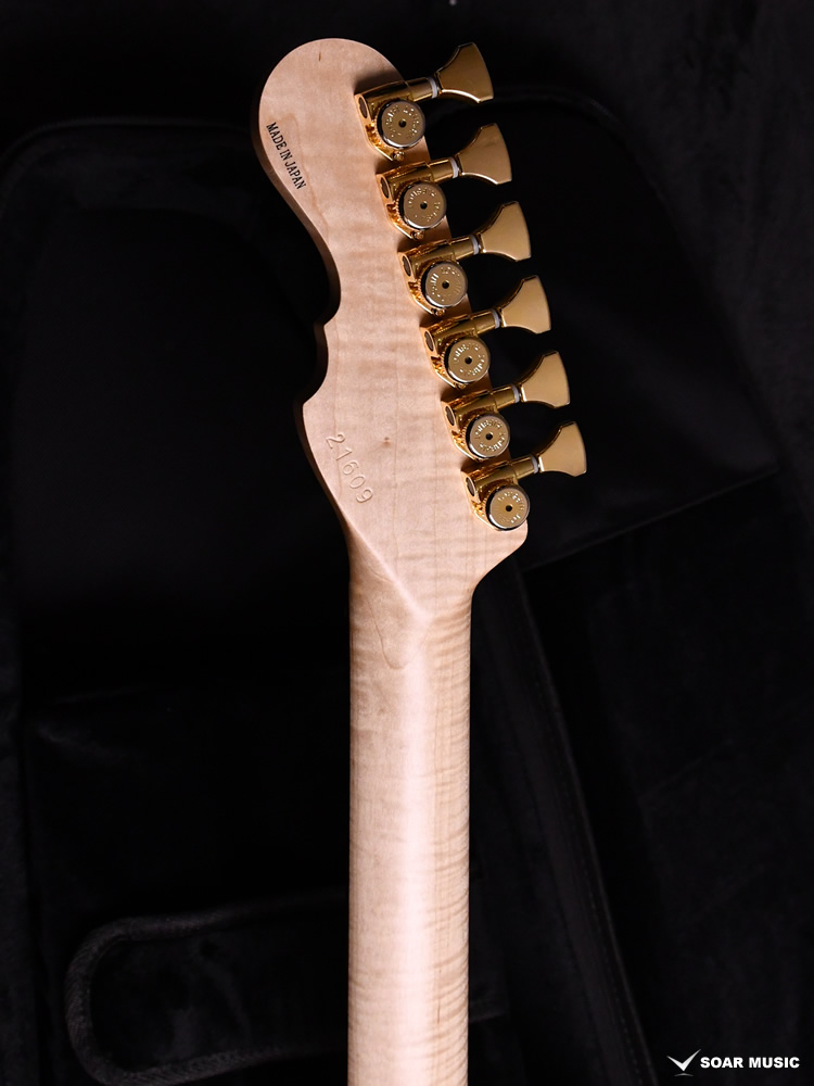 ボディトップ、バックそれぞれに最高グレードのフレイムトチを使用し、その杢目を最大限に生かした美しいバーストカラーが施されています。バック材にもトチが用いられていることにより、サウンド面でもその持ち味が発揮され、特徴的な中〜高音域にかけて広がる抜けの良いトーンを存分に感じることができます。