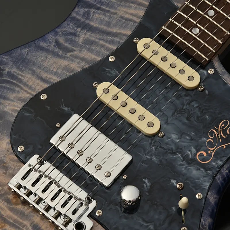 ネックには狂いの少ない柾目材で木取りされた材料を使い、ナットには「High Density Bone(水牛骨)」を使用し楽器としてのクオリティを上げると共に、パーツ関連にはUS製MojotoneRピックアップの搭載を始め、モダンシーンに合わせたハードウェアを組み合わせ、現代の音楽シーンを走るプレイヤーに送るMomoseの提案です。