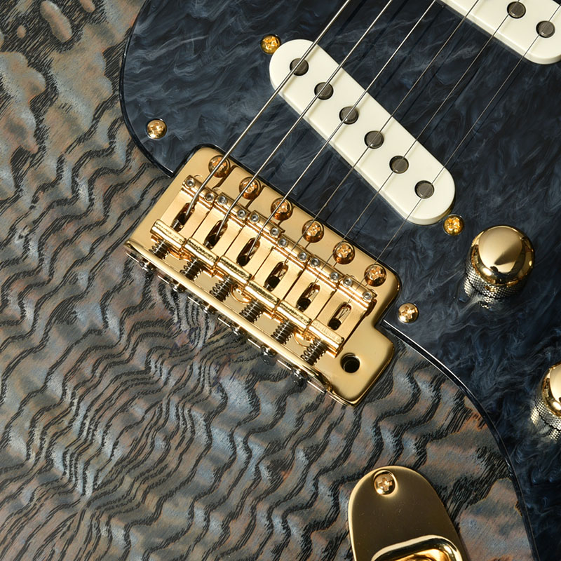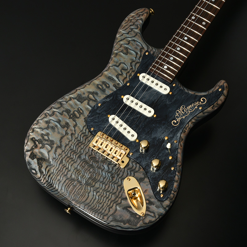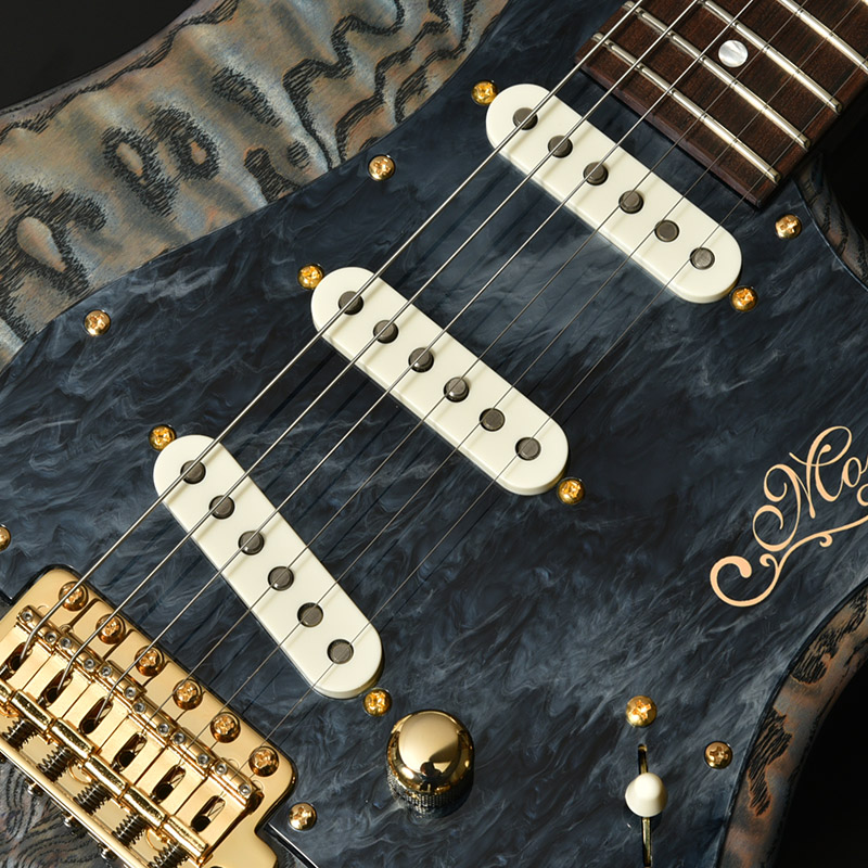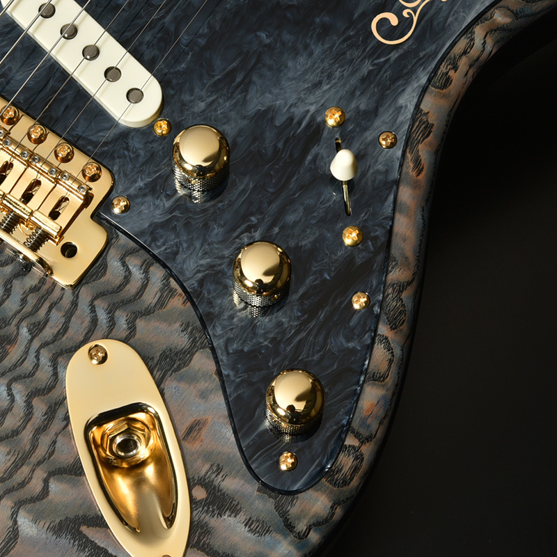 近年のその需要に対して希少性を増している、マダガスカルローズウッドを指板に採用。レギュラー製品では採用を終了しており、本数限定製作のショーモデルだからこそ実現した仕様となります。ネック材のフレイムメイプルは、ヘッドストックの先端までストライプの入ったハイグレードな個体を厳選。芸術的なルックスをぜひその目でお確かめください。