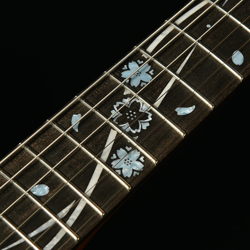 京都を流れる鴨川から着想を得た流れるようなインレイは、氷のような色味のアクリル材を使用することで冬を感じられる仕様に再構築。また、桜ギターのモチーフでもある和傘の女性をピックガードに、桜の枝と花のデザインをヘッド上部に取り入れており、桜ギターとして統一感のある仕上がりとしています。