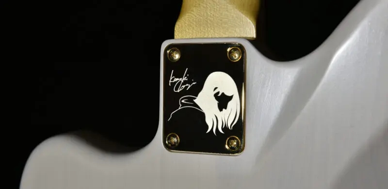磯貝のアイコンとサインがレーザーによって彫られたオリジナル仕様のネックプレートでジョイント。トラディショナルなサウンド特性を損なわない為にオーソドックスなプレートジョイントを採用しながらも、プレート部を落とし込み加工しています。これにより、ジョイント近くのハイポジションでもプレートに手が引っ掛からなくなり、演奏性の向上を実現しています。