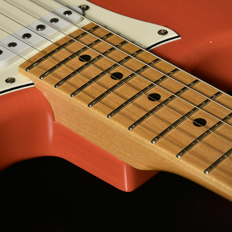 ビンテージスタイルよりもフラットに近い310Rの指板を採用しています。これによって今まで以上に弦高を低く設定することが可能になり、速い押弦が必要なテクニカルなプレイにも挑戦しやすくなりました。