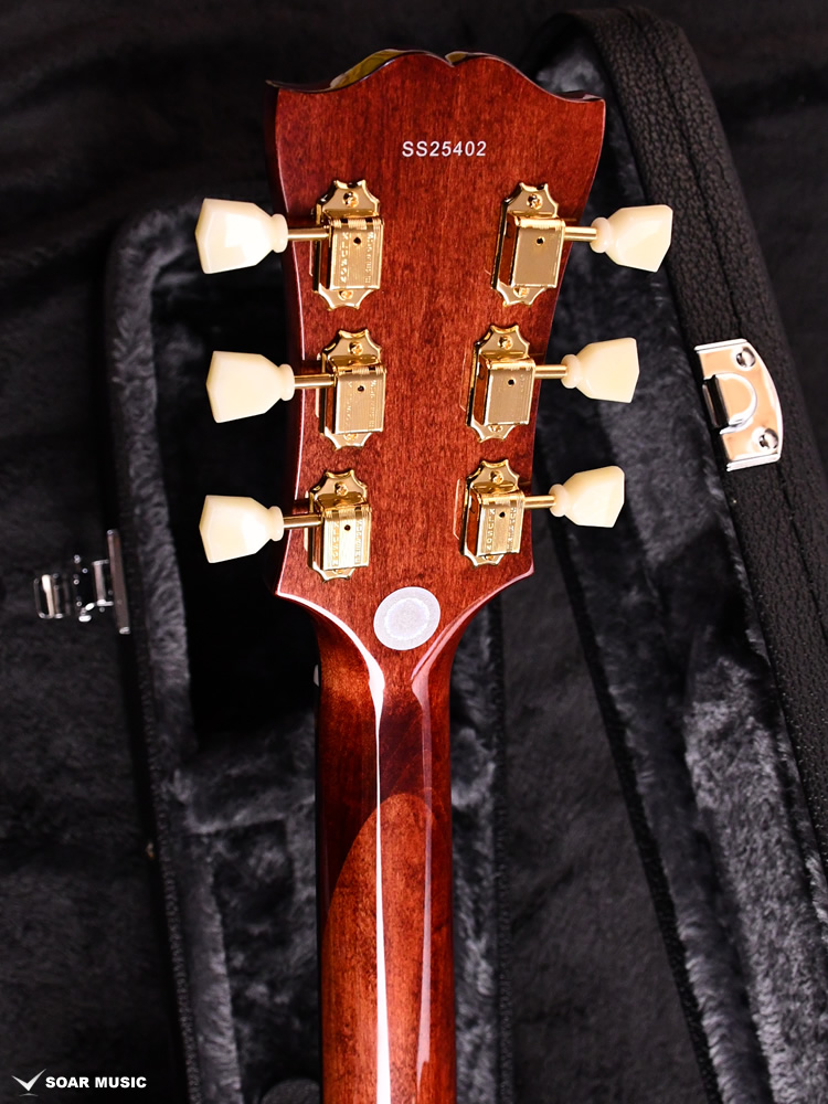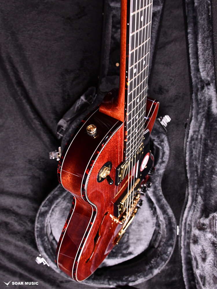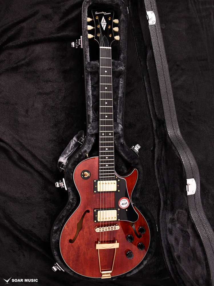 ボディトップにはプレーンメイプルを採用し、バック材にはマホガ二ーに似た音響特性で知られるアフリカ原産のオクメ材が使用されています。セミホロウモデルながらエレキギターに求められる芯のあるサウンドも持ち、Jazz以外のジャンルにも対応可能です。
